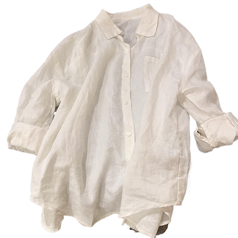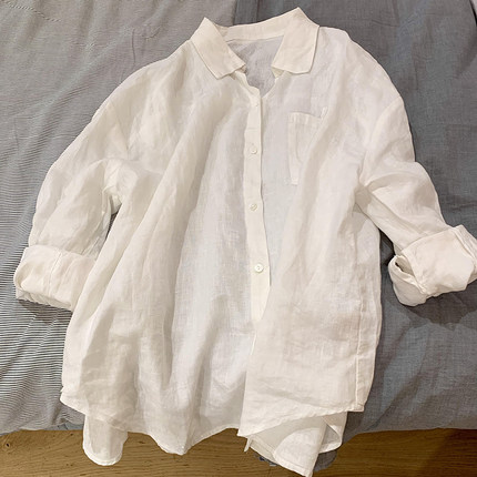 极简风白色翻领单排扣棉麻衬衣春