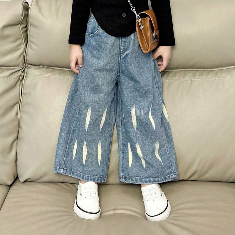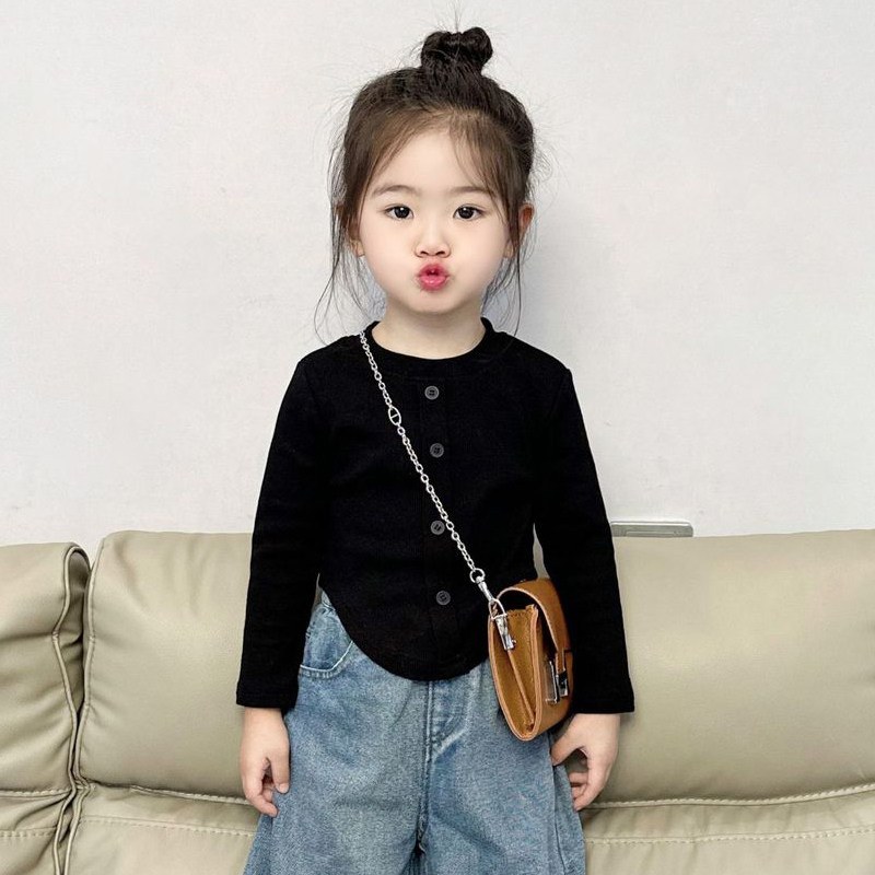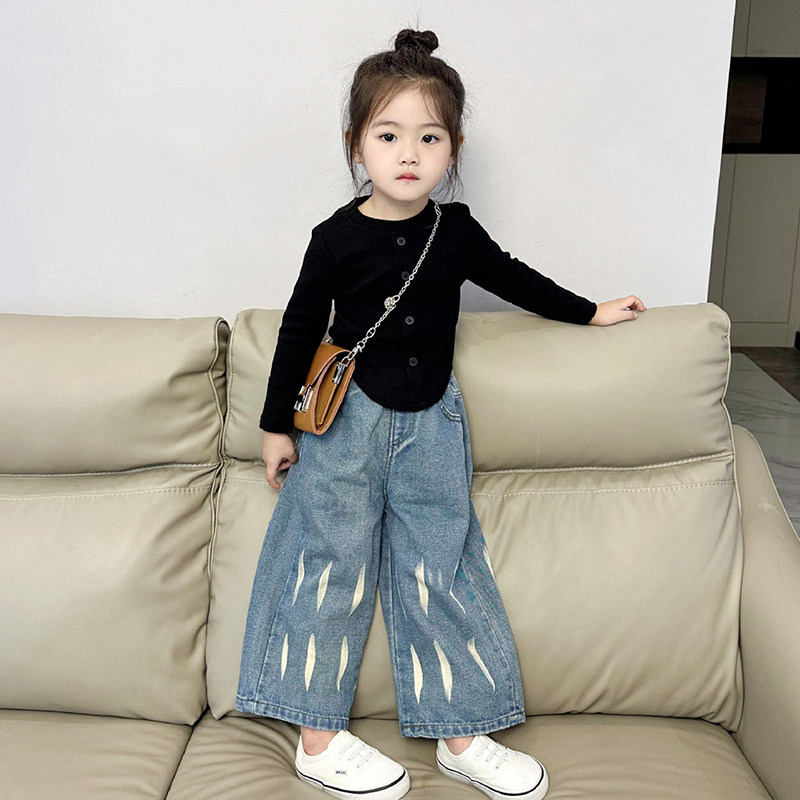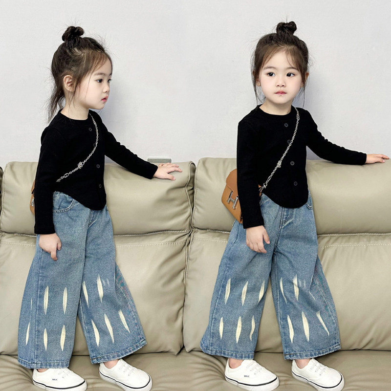 韩版女童套装2025春秋新款女宝宝黑色打底T恤衫+牛仔阔腿裤两件套