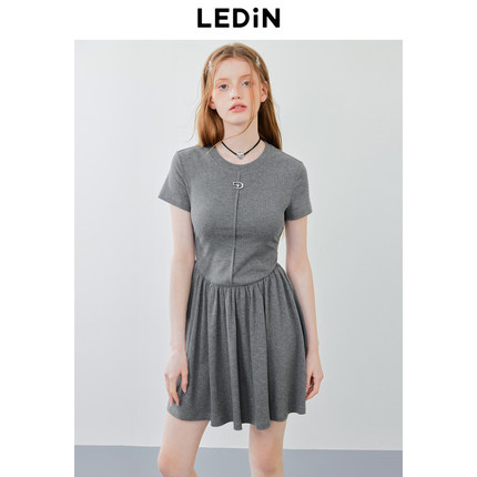 乐町针织短袖裙夏季新款设计感漏背连衣裙深灰色修身连衣短裙