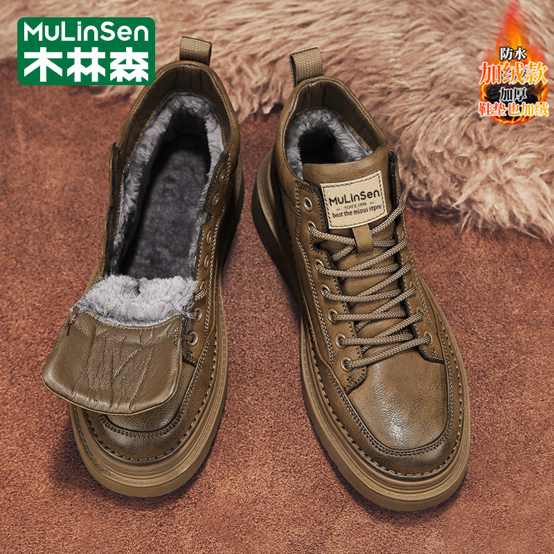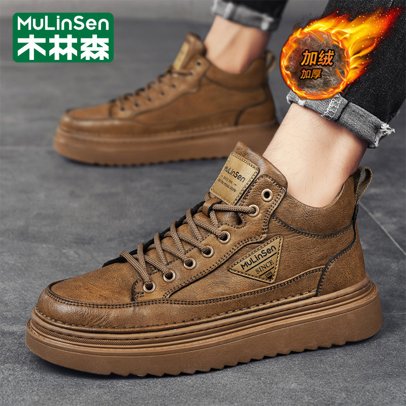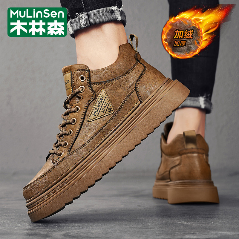 木林森男鞋冬季加绒加厚中高帮板鞋休闲运动皮鞋马丁工装棉鞋短靴