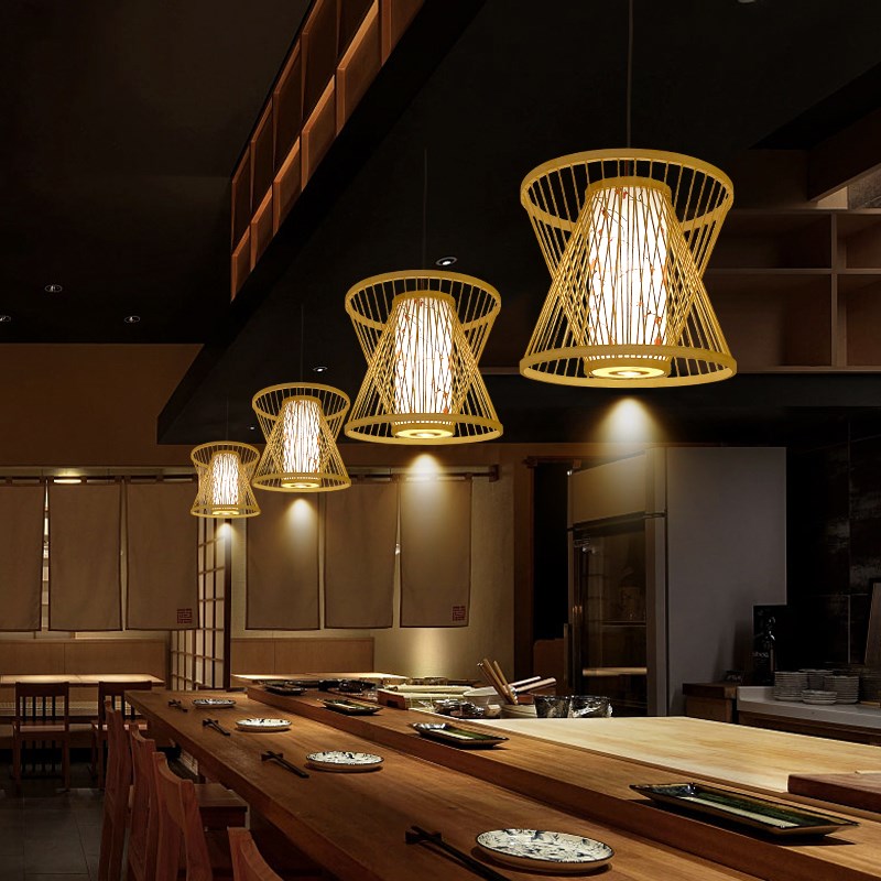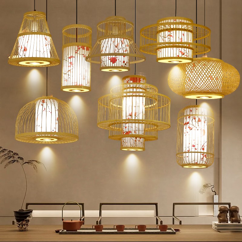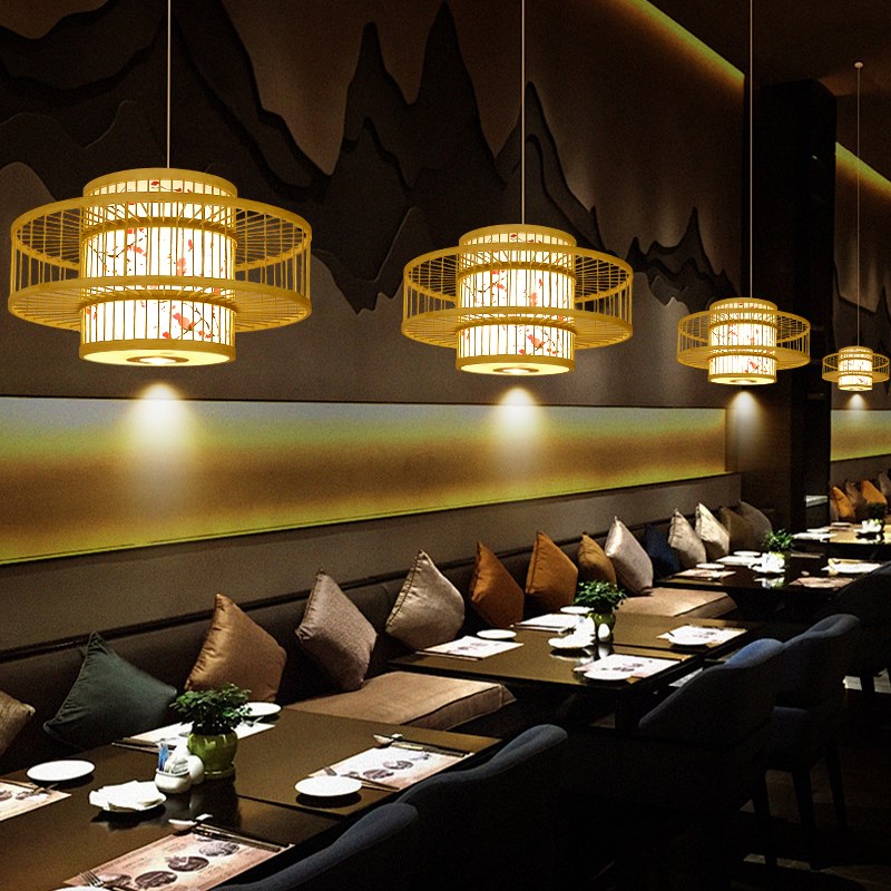 中式竹编餐厅商铺火锅店吊灯带射灯酒店餐饮饭店包厢竹艺灯笼