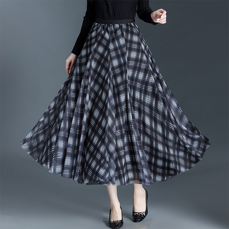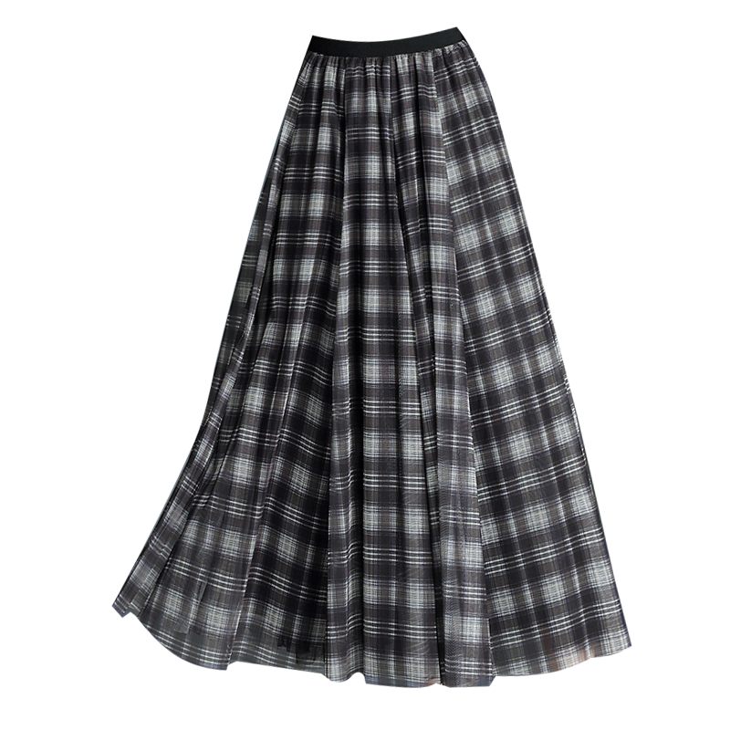 两面穿格子网纱秋冬气质长裙女遮胯显瘦a字大摆半身裙镶砖纱裙