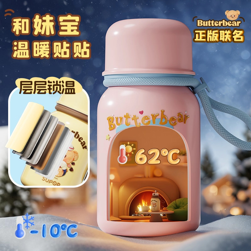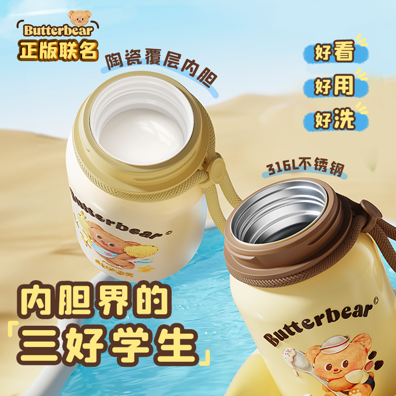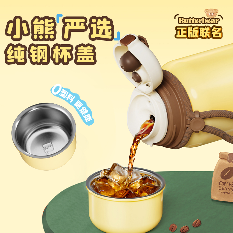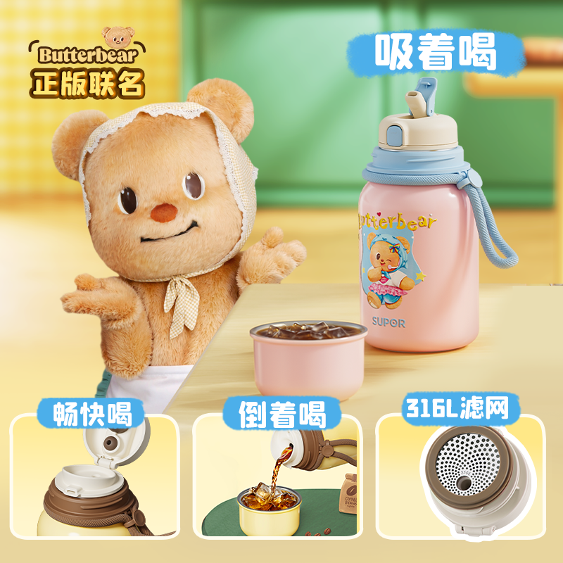 苏泊尔2025新款黄油小熊联名保温杯女生大容量水杯便携吸管双饮杯