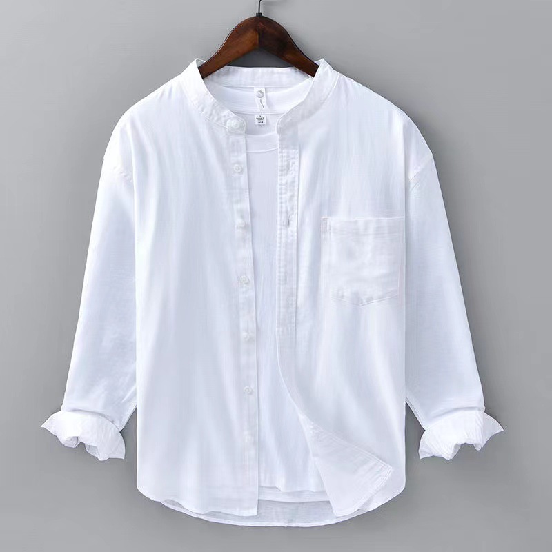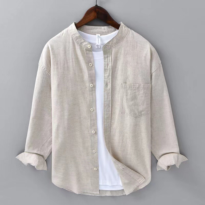 春秋薄款长袖亚麻衬衫男士立领休闲简约上衣青年宽松透气棉麻