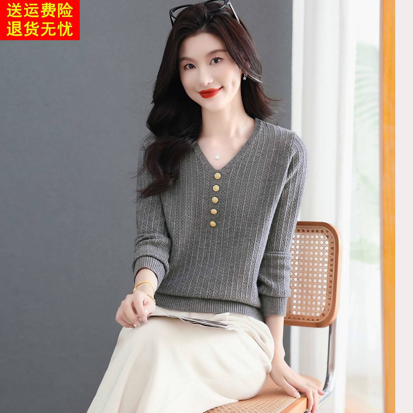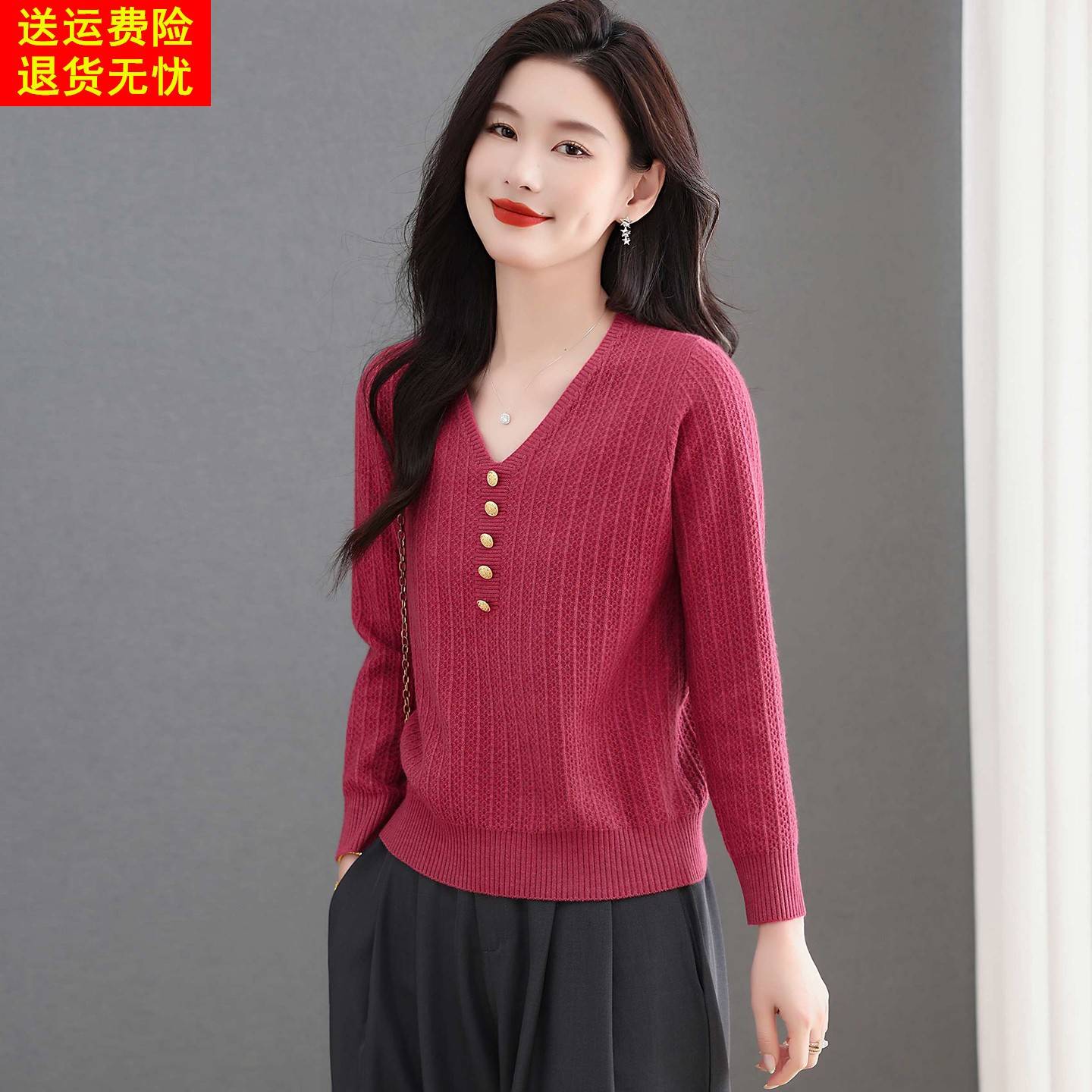 鸡心V领针织衫t恤女士春秋季2025新款打底衫宽松显瘦遮肉内搭上衣