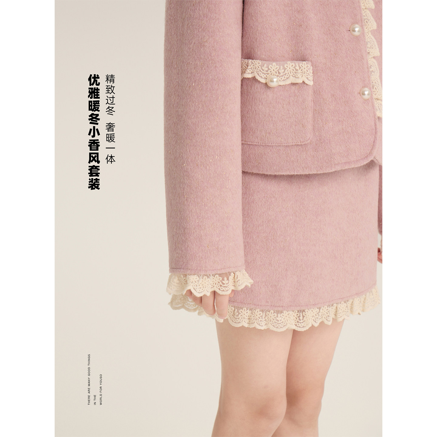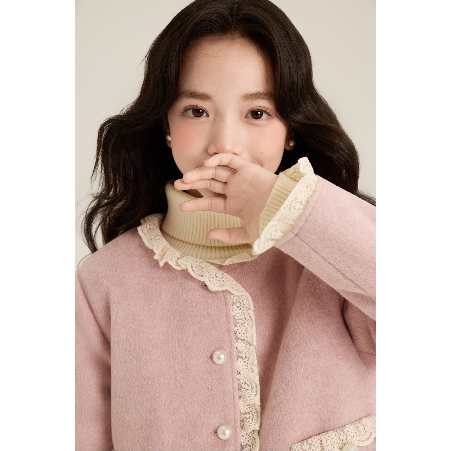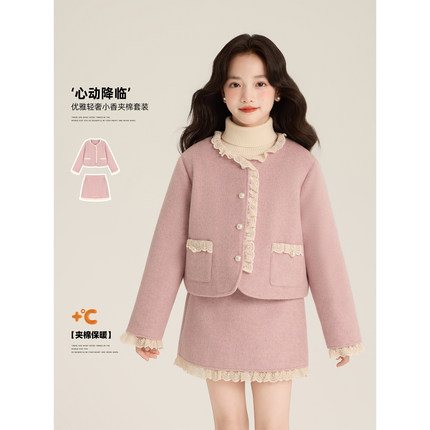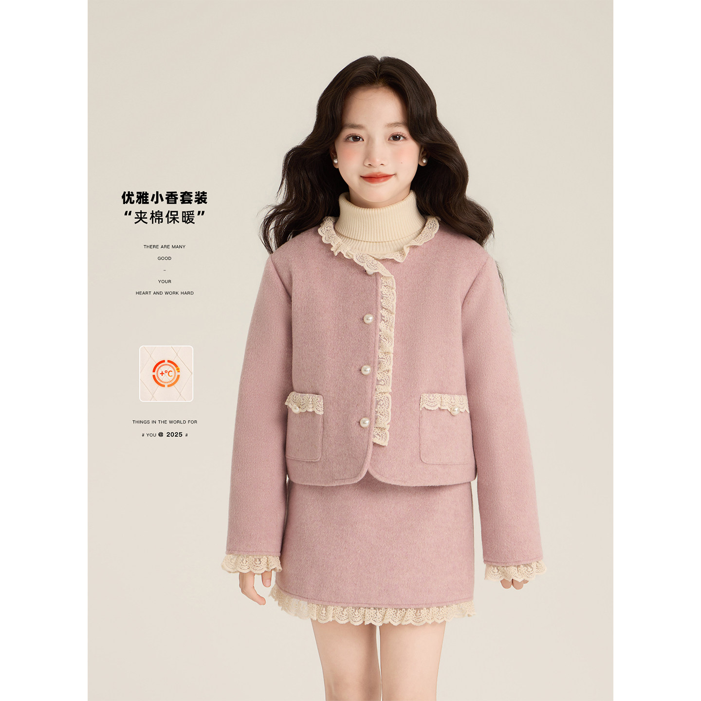 Amybaby女童套装冬季2025新款气质优雅小香风蕾丝花边外套半身裙
