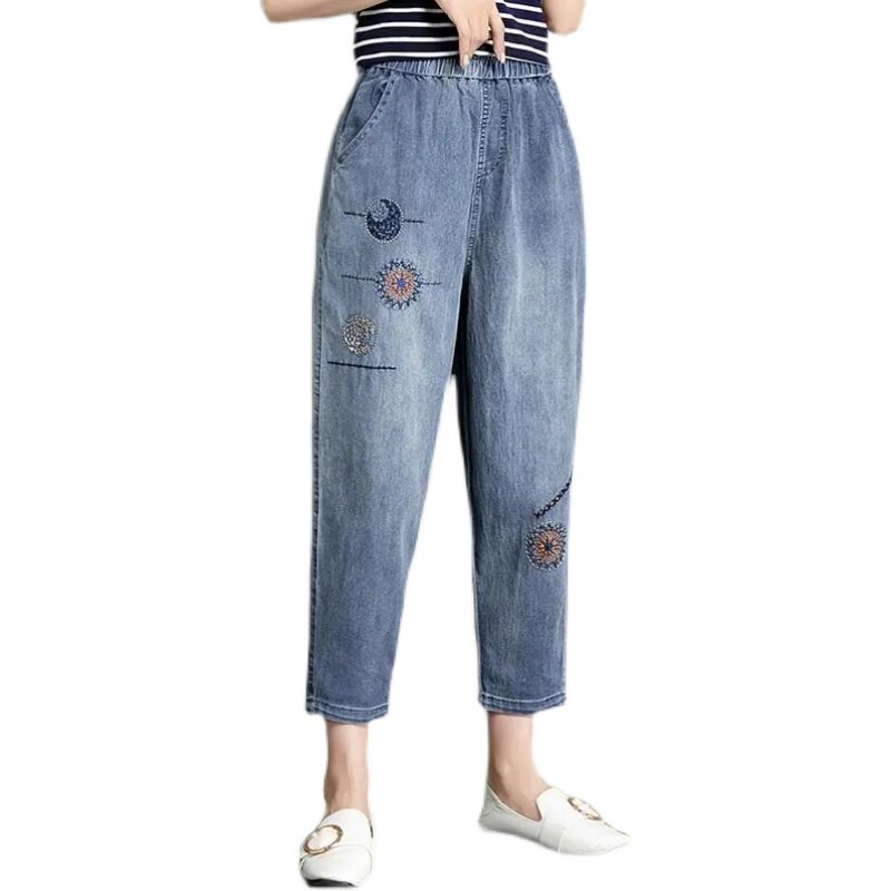 牛仔哈伦裤女宽松显瘦2025春秋新款文艺刺绣萝卜裤大码九分老爹裤