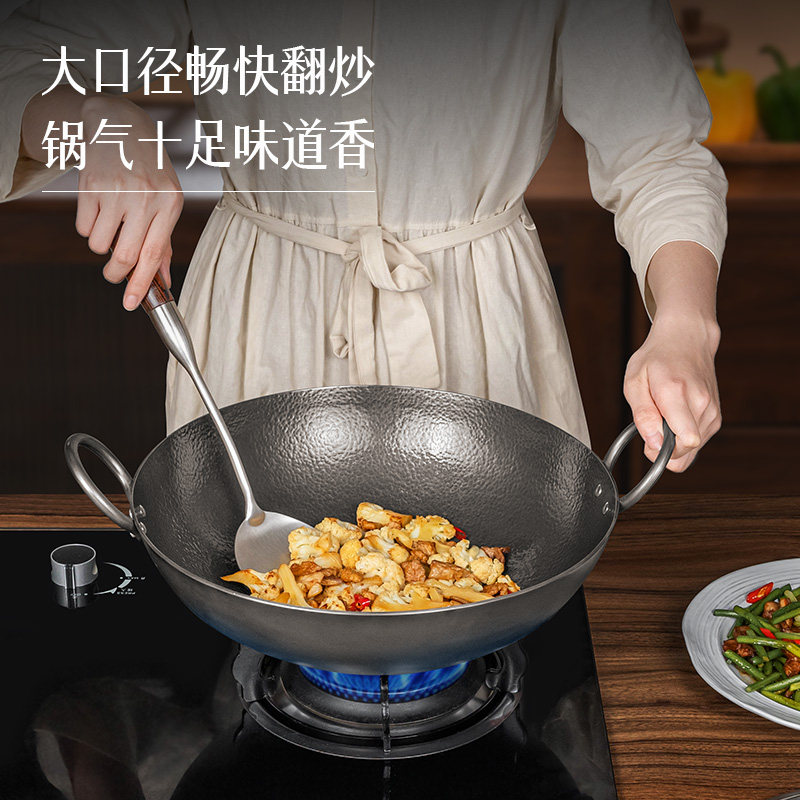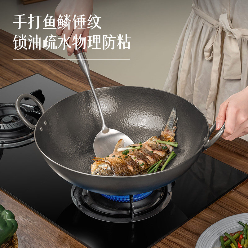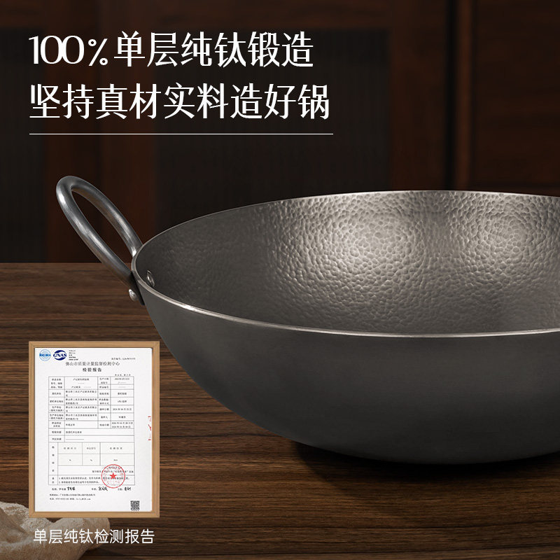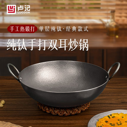 卢记钛锅纯手工锻打纯钛炒锅无涂层不粘锅家用炒菜锅老式双耳炒锅