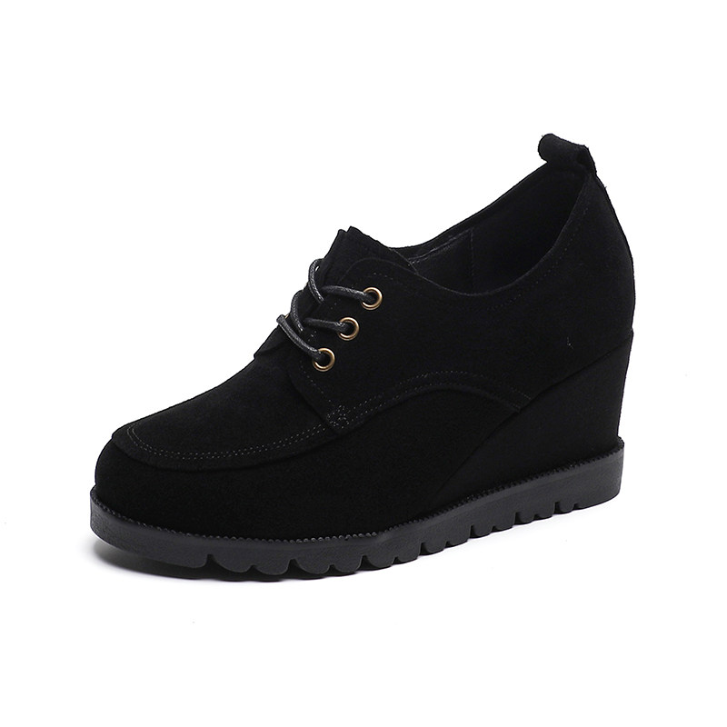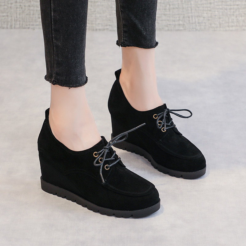 内增高女鞋8cm春秋新款坡跟厚底松糕单鞋百搭真皮系带休闲乐福鞋