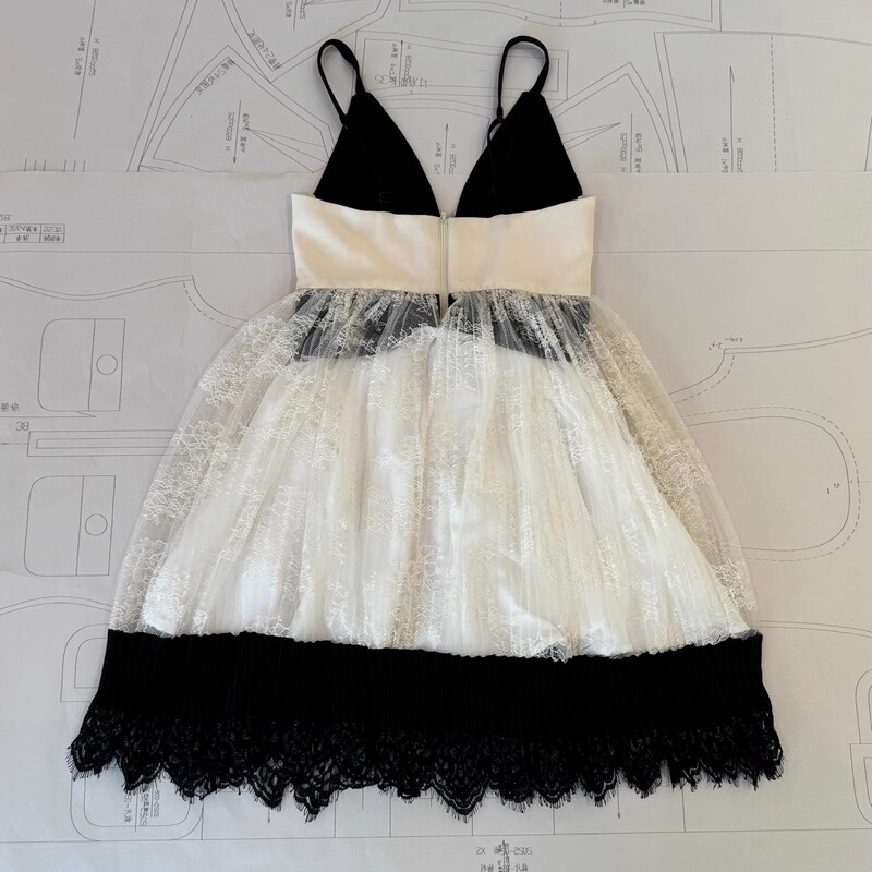气质千金蕾丝拼接设计感V领吊带黑白撞色连衣裙珍藏款成衣