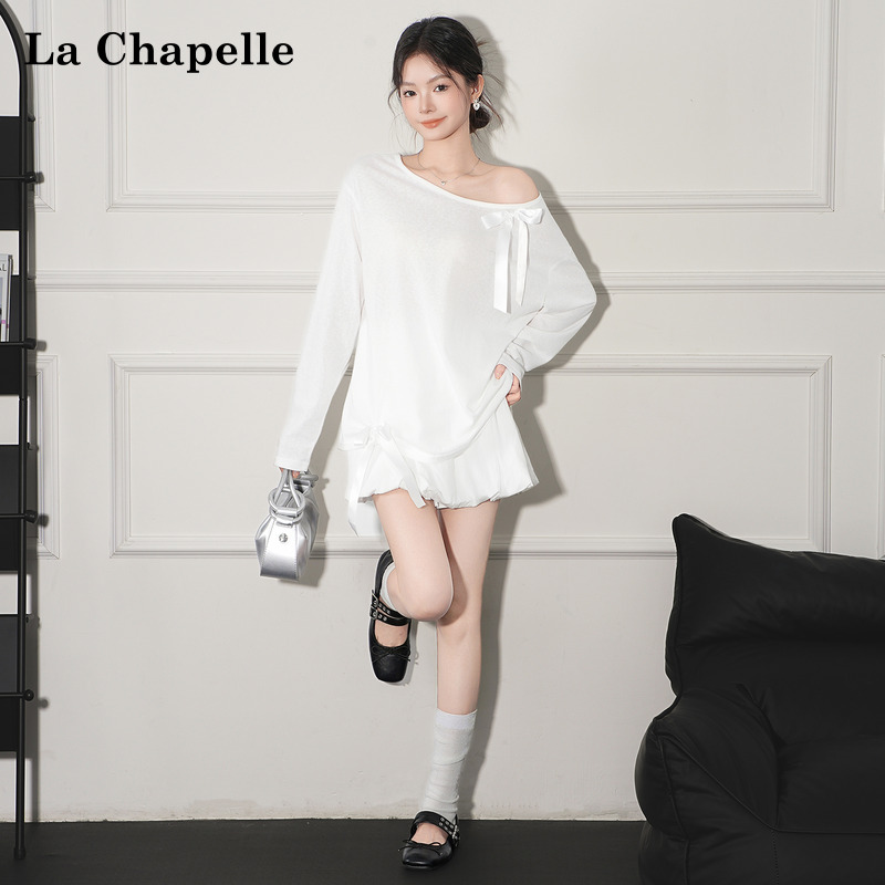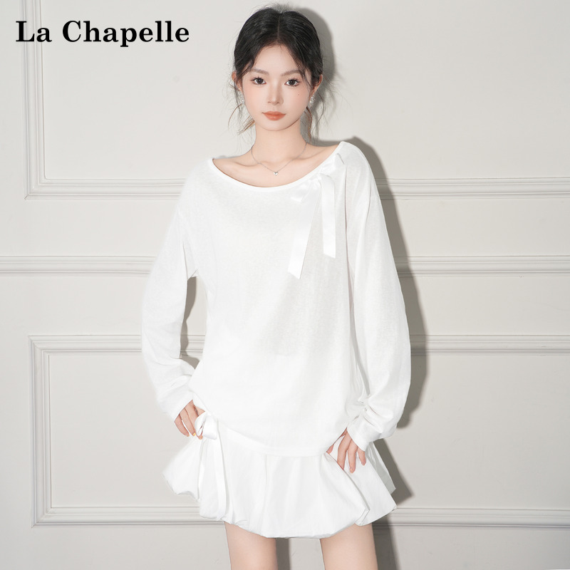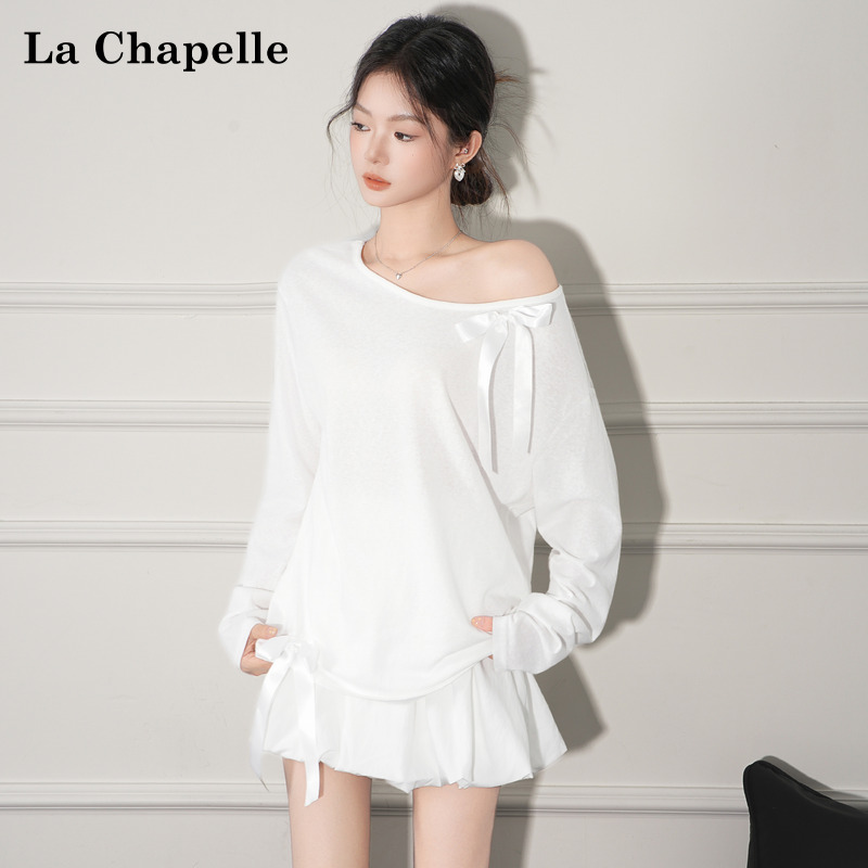 拉夏贝尔法式气质斜肩蝴蝶结绑带白色长袖t恤女2025早秋宽松上衣