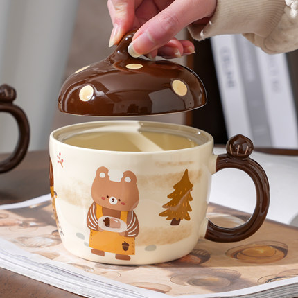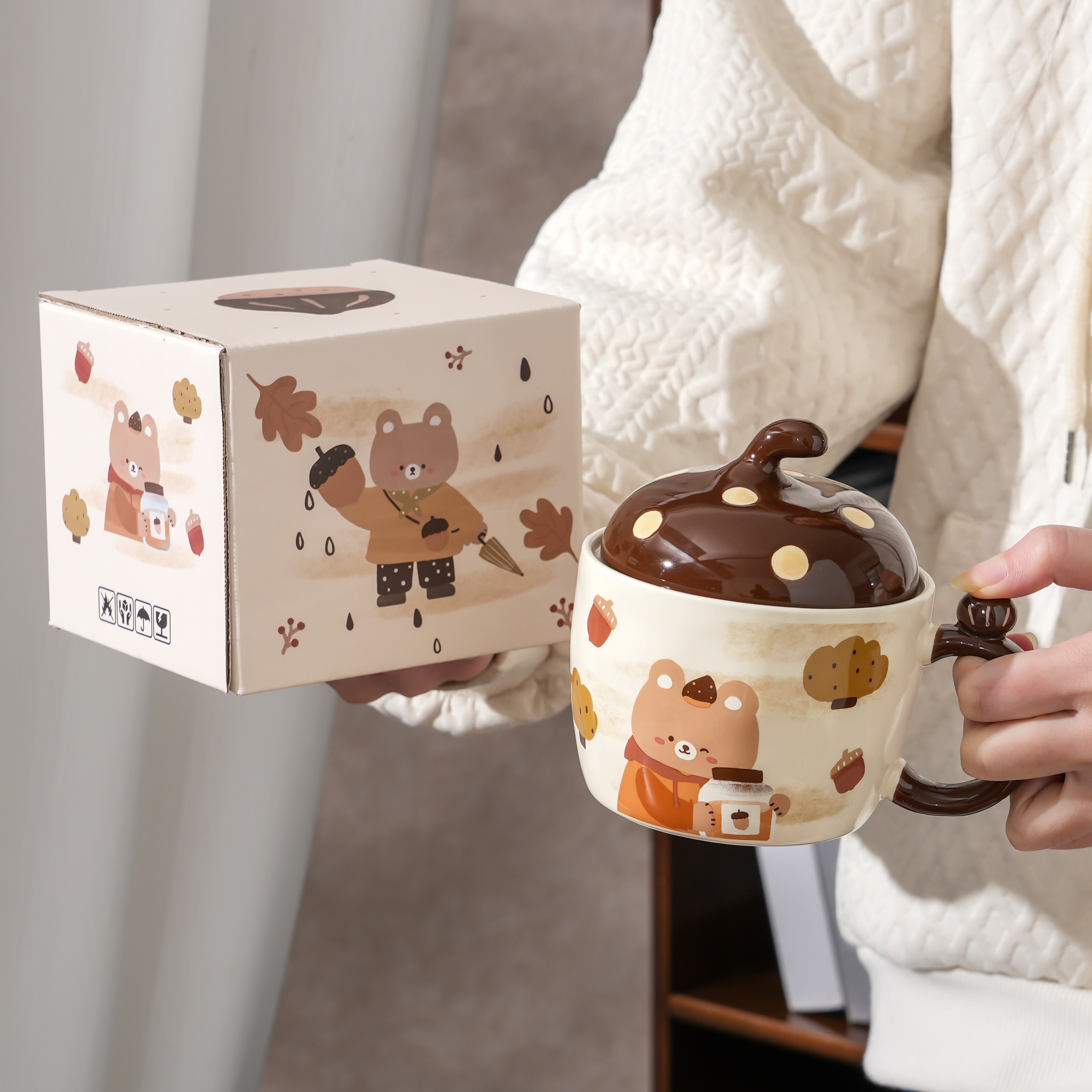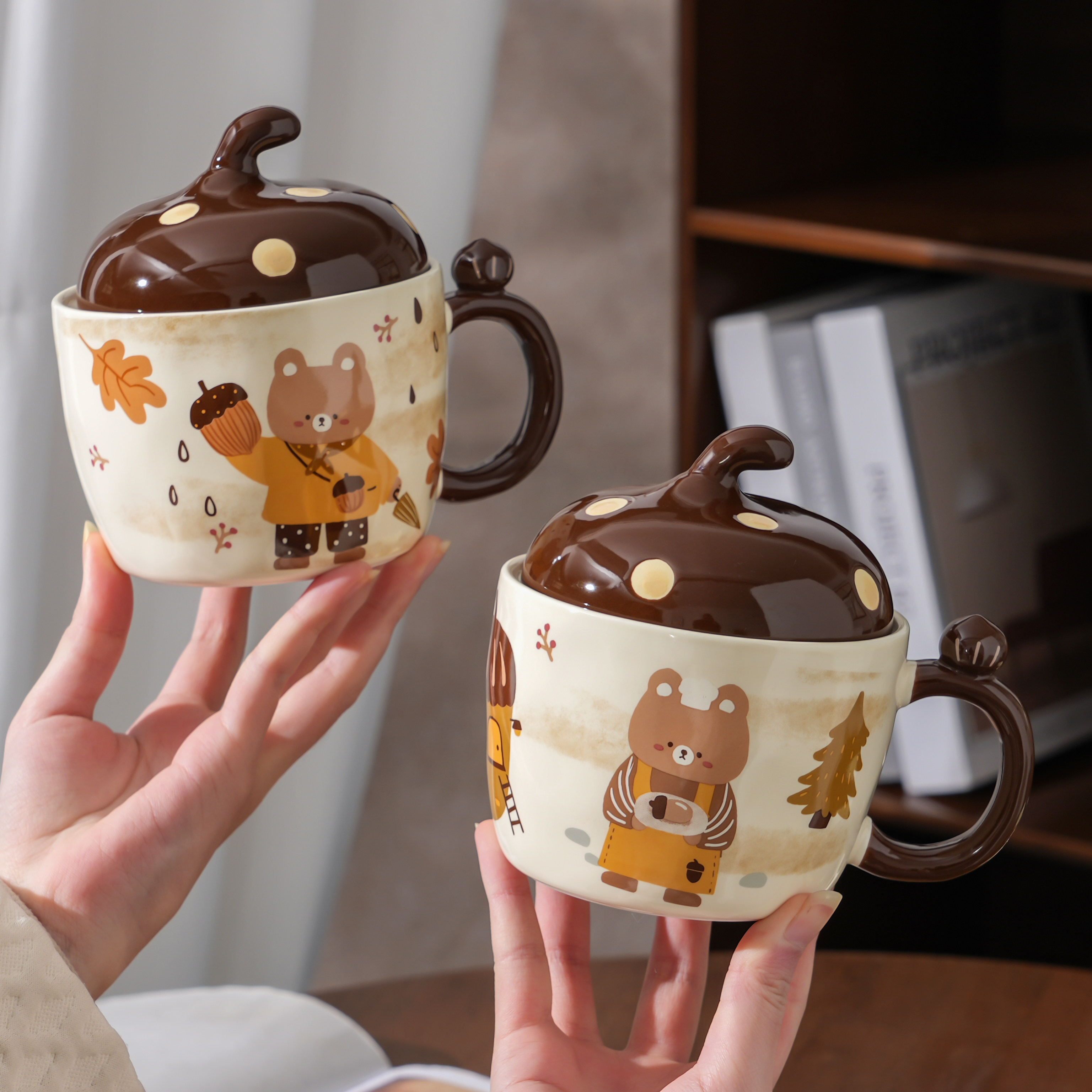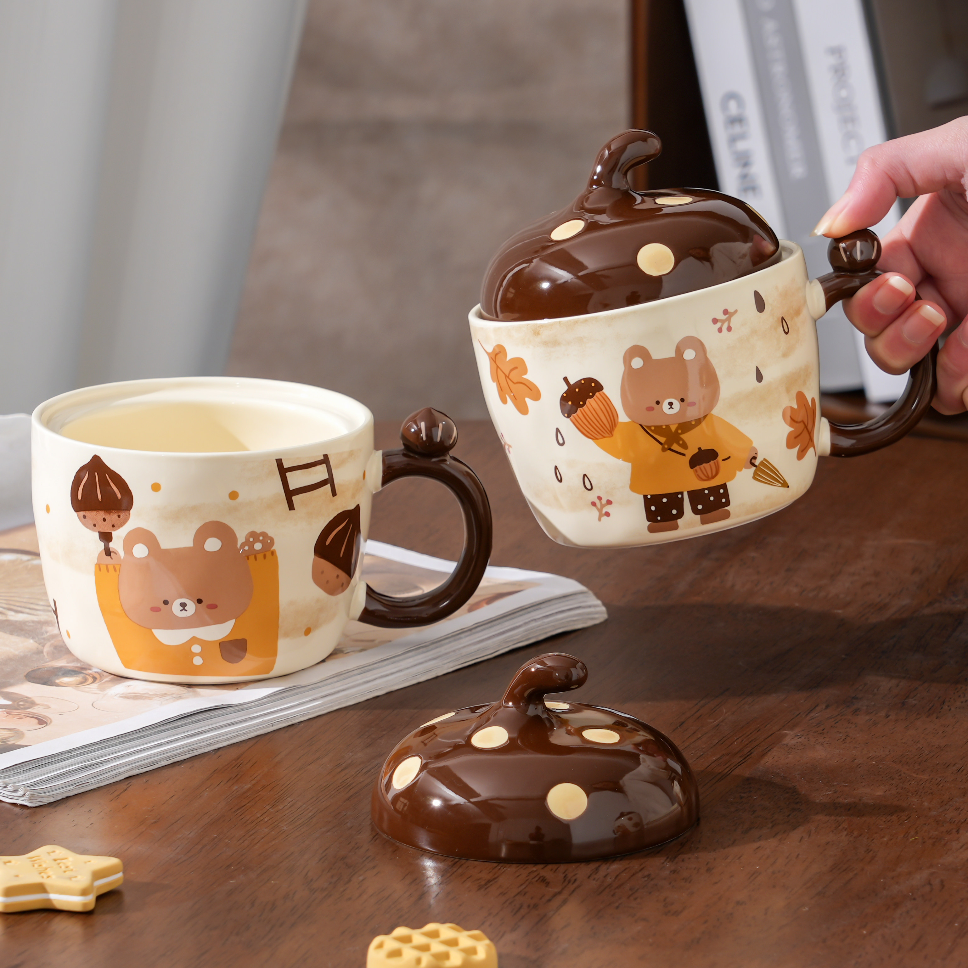 栗子小熊卡通陶瓷杯可爱带盖创意早餐咖啡杯新款高颜值耐热马克杯