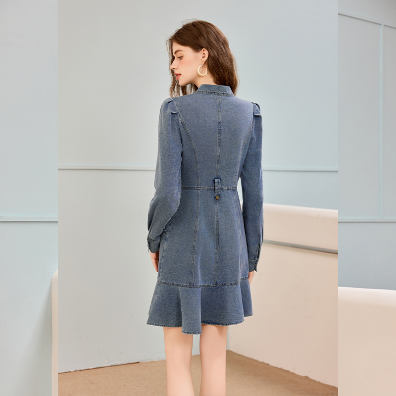 白鹿语复古浪漫泡泡袖牛仔连衣裙