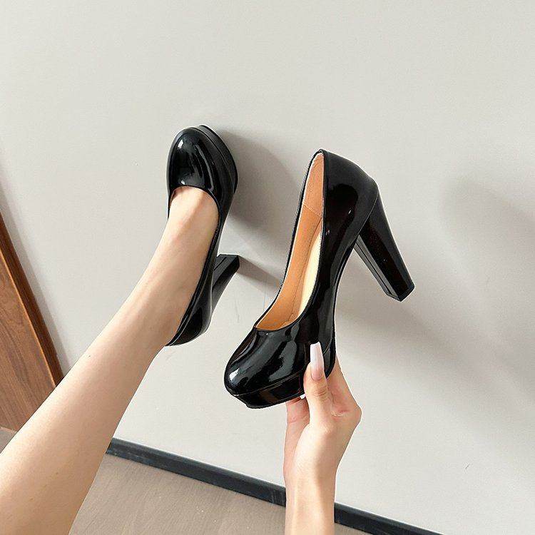 大码白色高跟鞋女粗跟浅口防水台圆头单鞋红色婚鞋漆皮职业鞋子女