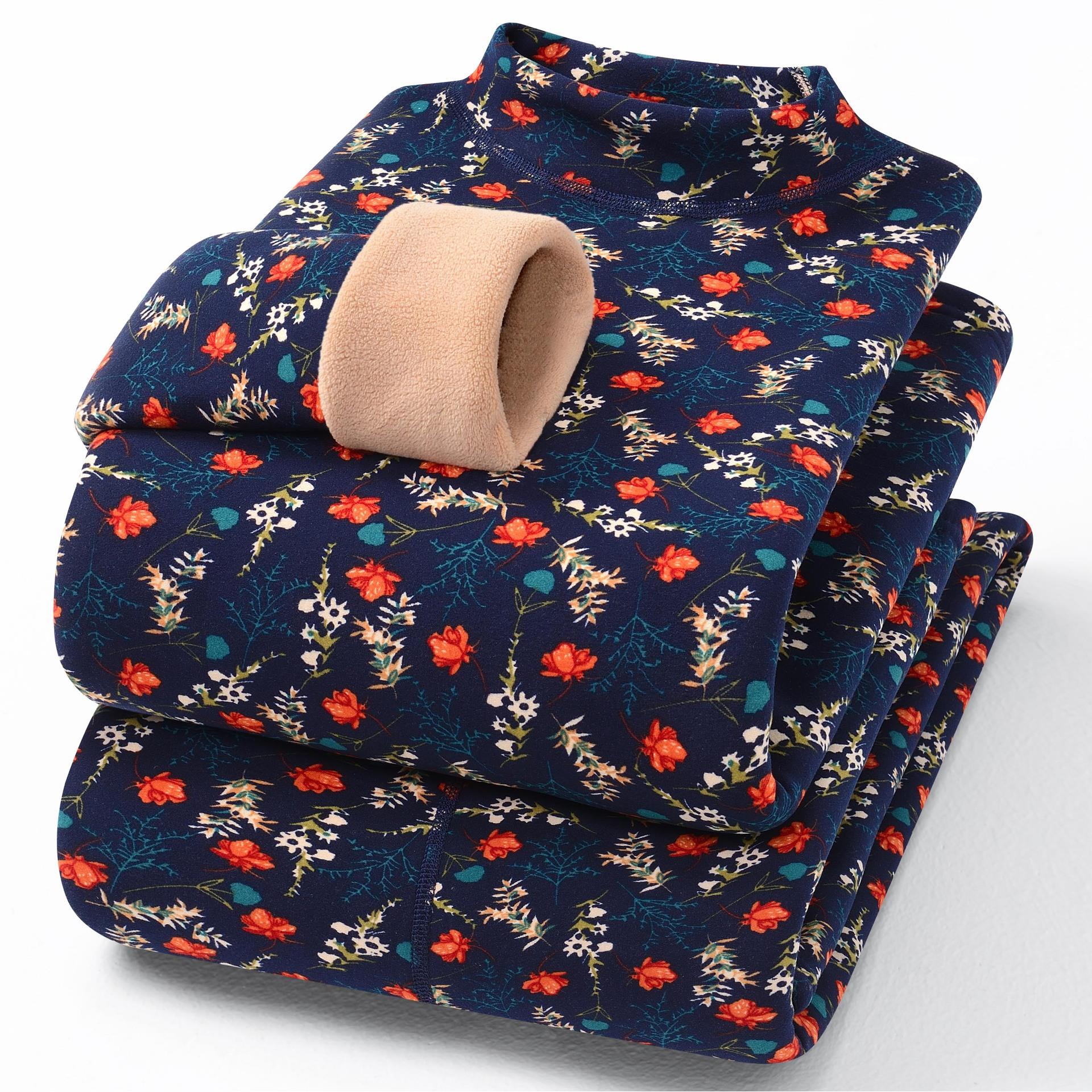 冬季女士半高领保暖内衣碎花驼绒套装中老年妈妈加绒加厚秋衣秋裤