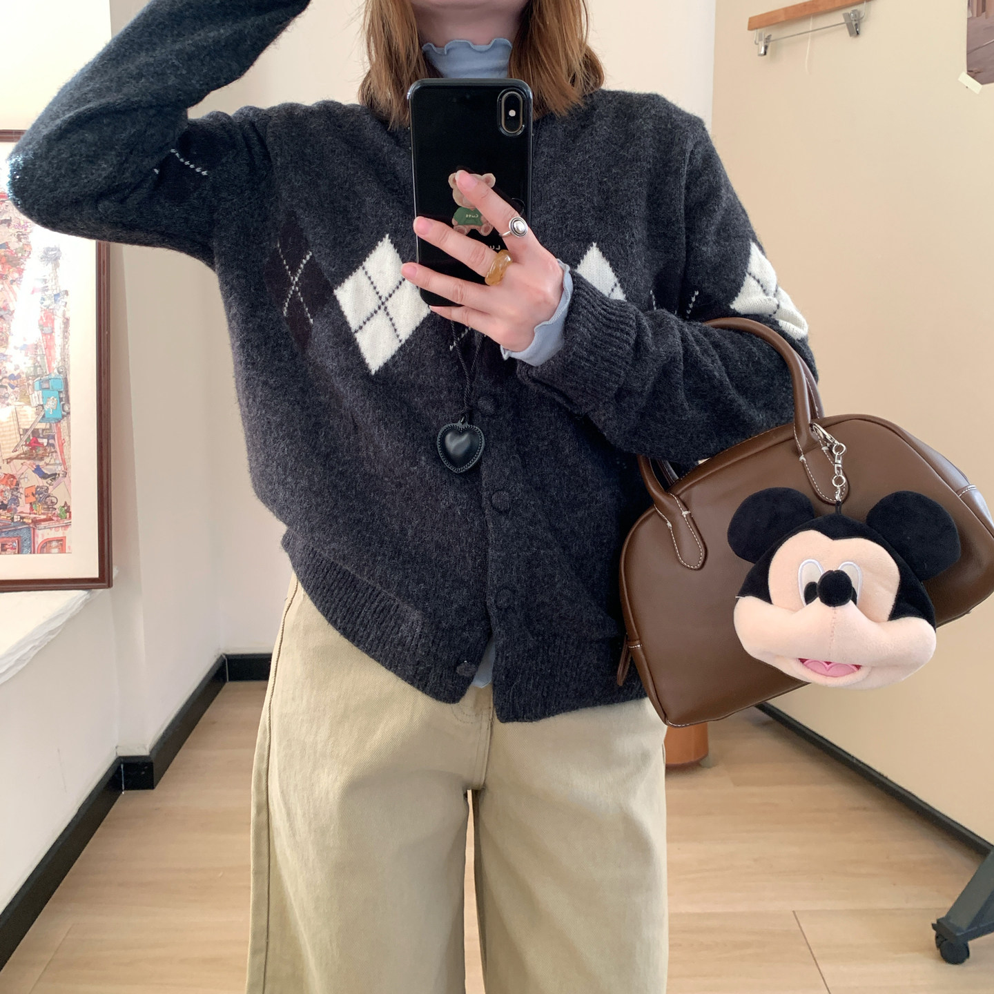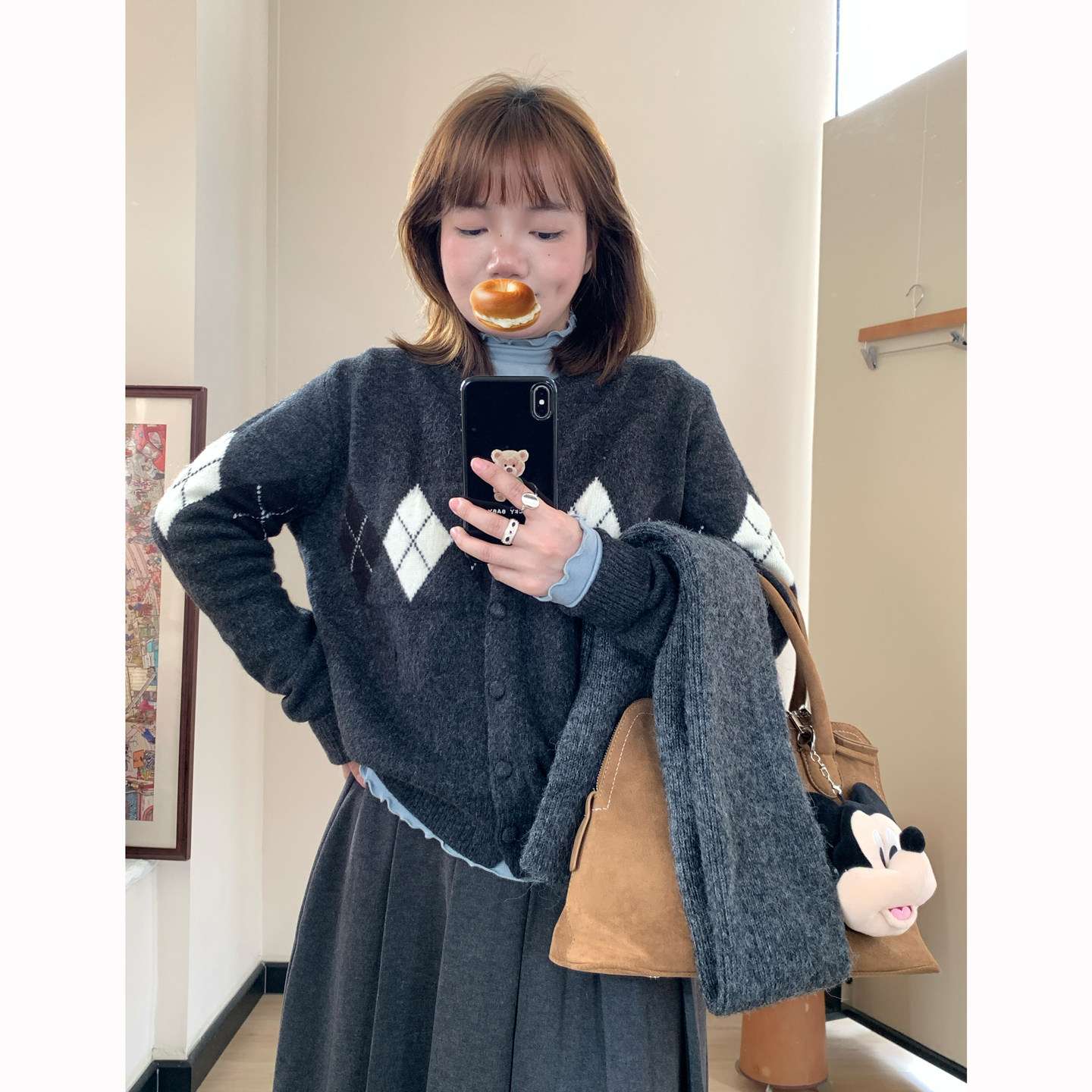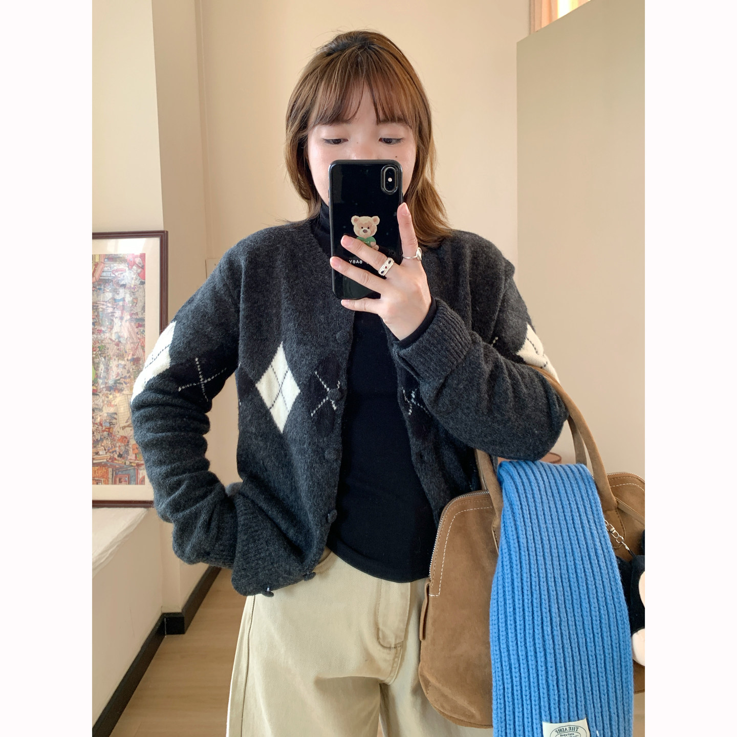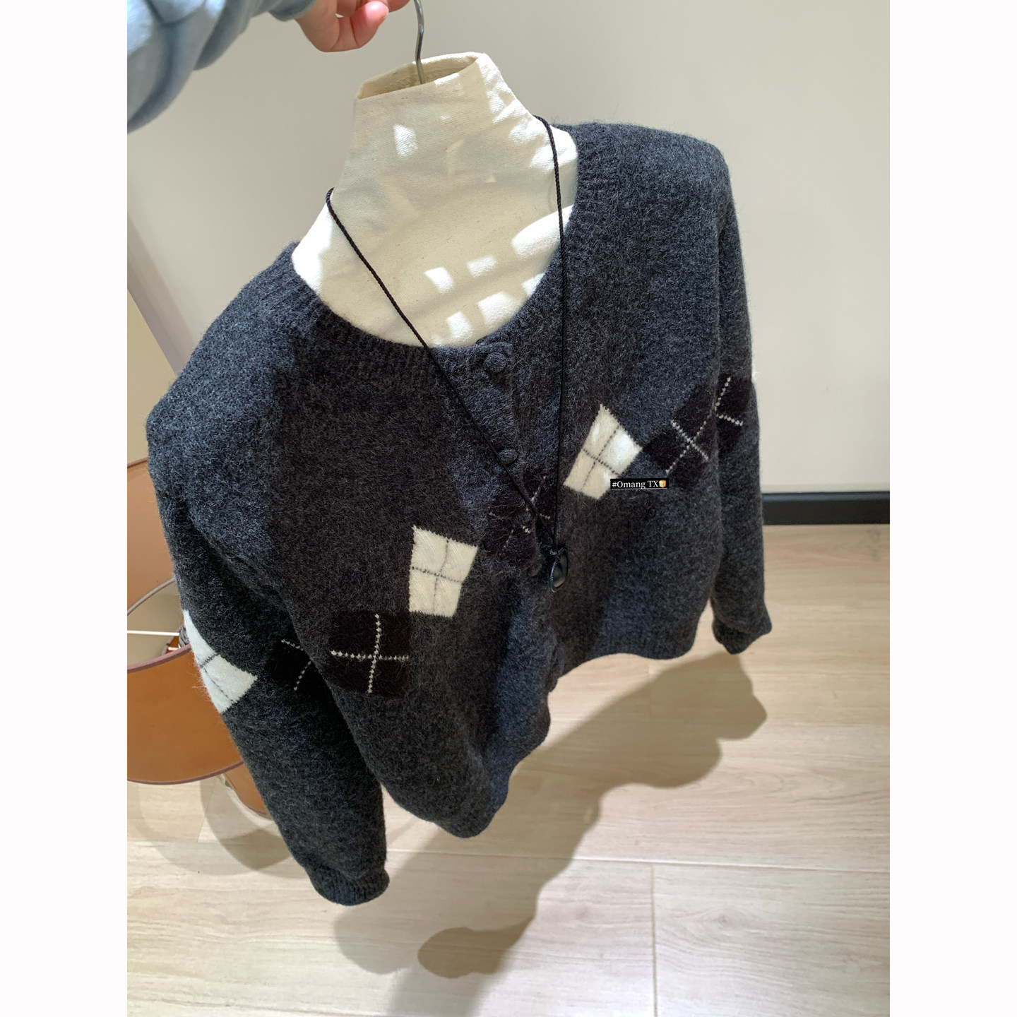Omang桃喜 菱形格拼色毛衣开衫女春秋韩系设计感学院风针织外套