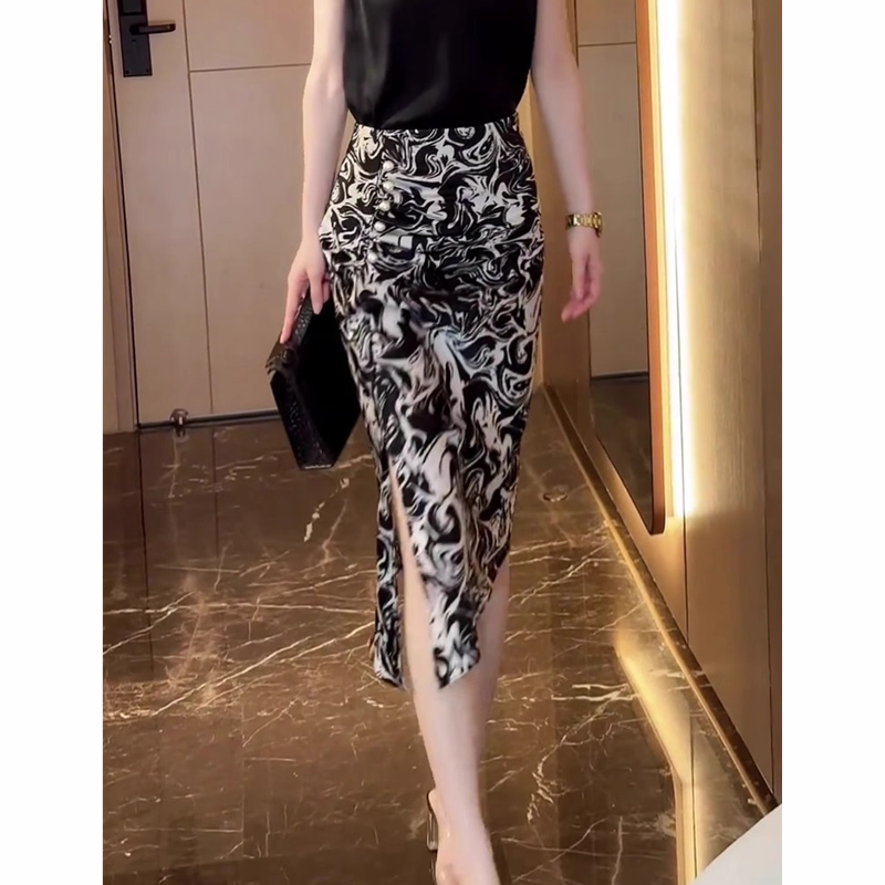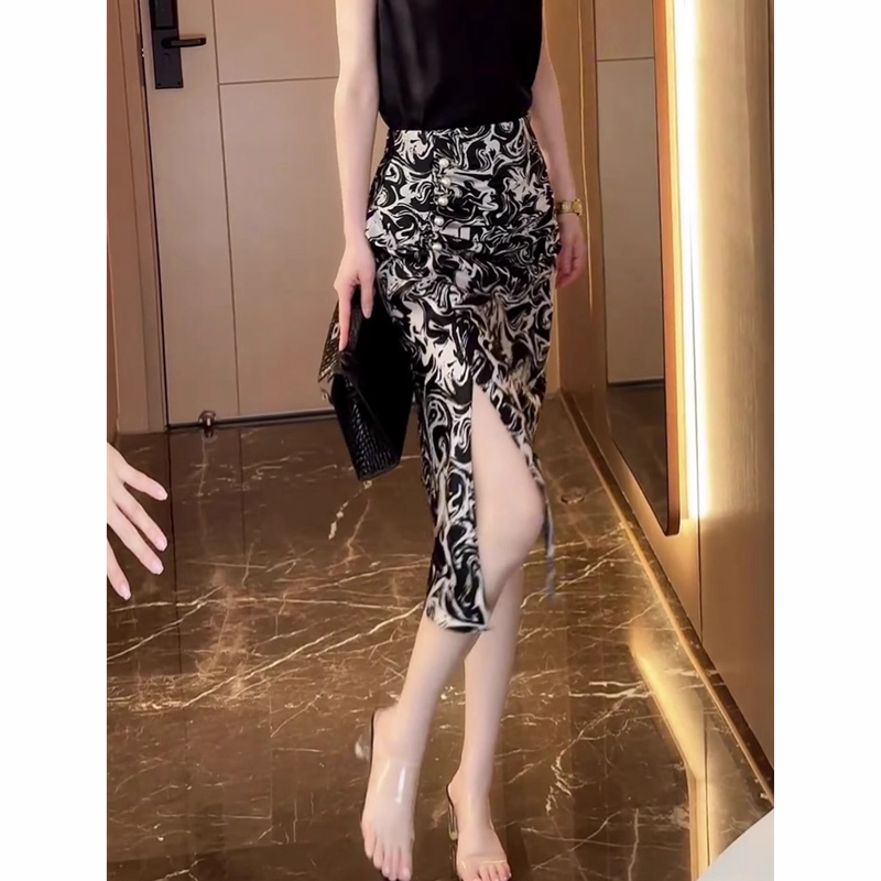 不规则缎面印花开叉半身裙女2025夏季新款气质高腰洋气修身a字裙