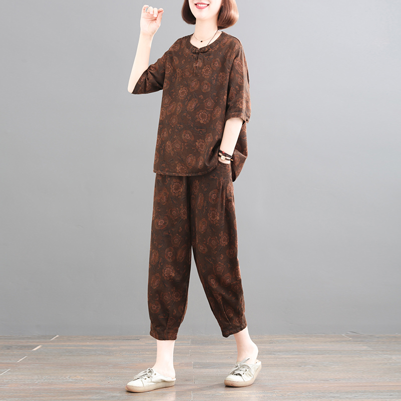 孔雀飞飞2025夏装新款韩版大码遮肉印花两件套棉麻女装套装高端