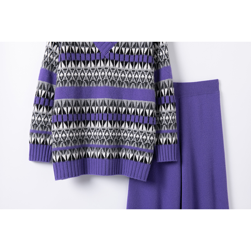 匠心系列实用穿搭!紫色几何提花v领廓形100%羊绒毛衣女2024新品