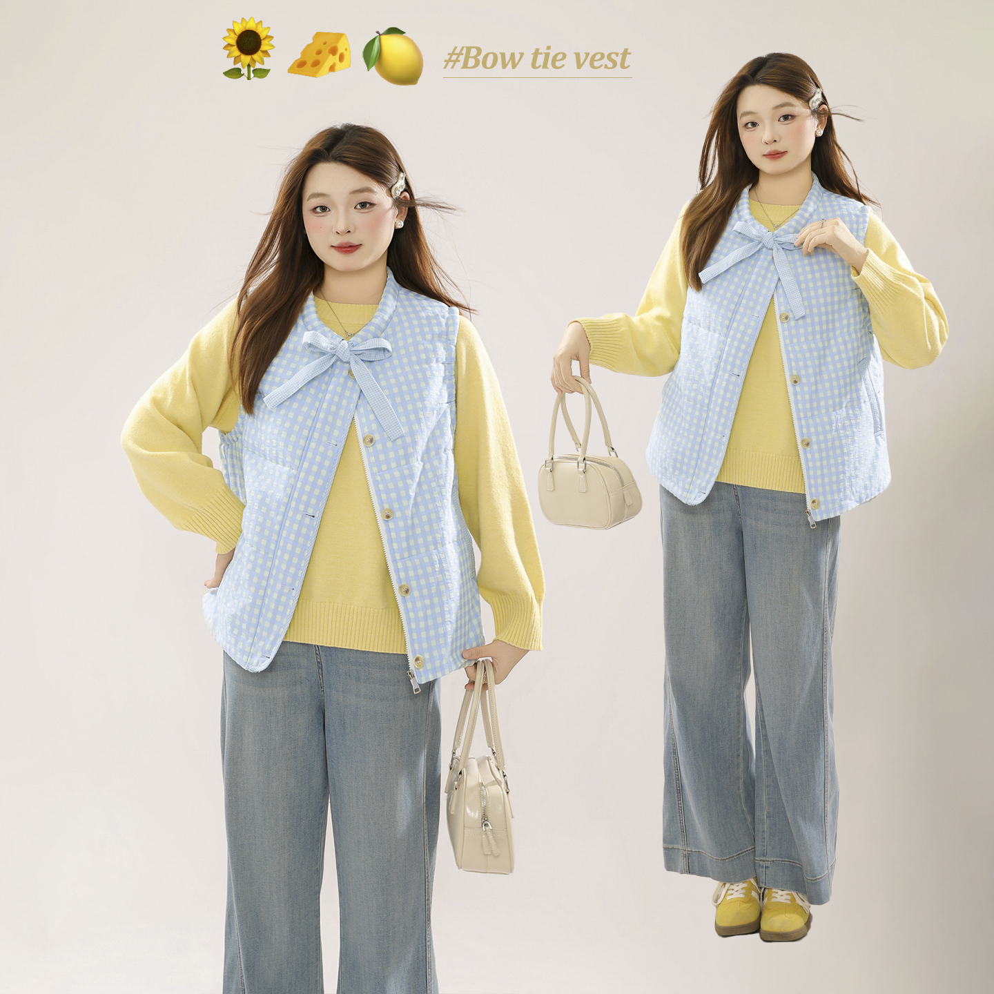 DM100大码百分百女装微胖mm秋季保暖叠穿百搭蓝白格纹棉服马甲