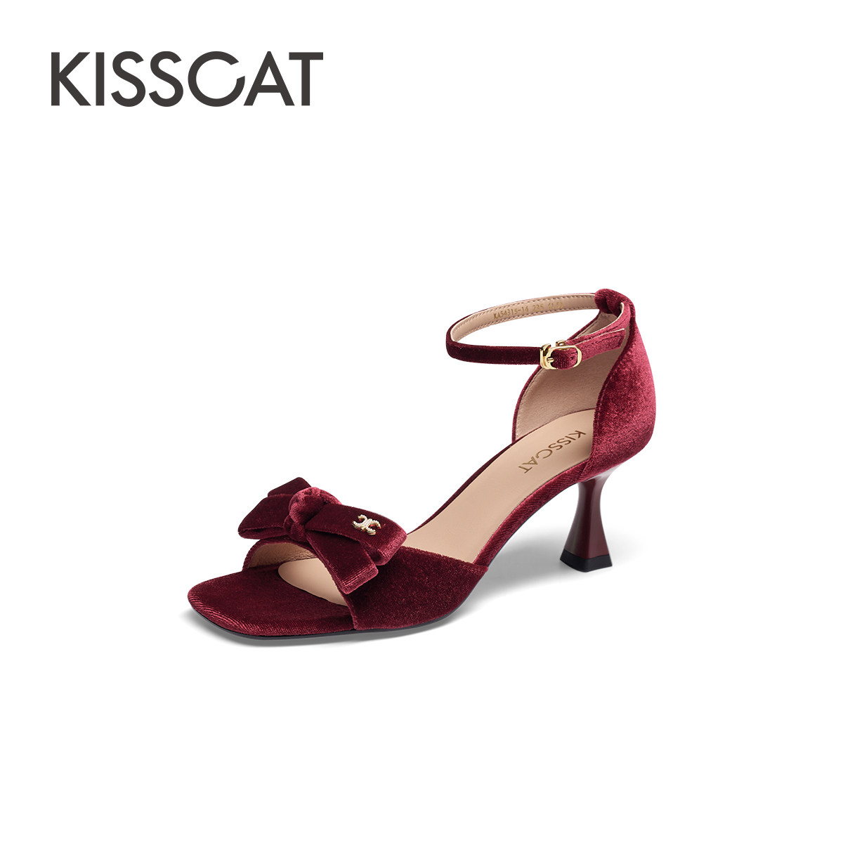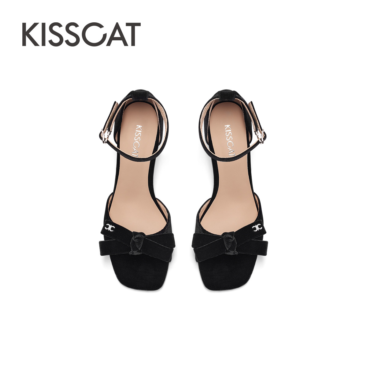 KISSCAT接吻猫夏季气质休闲绒面蝴蝶结高跟鞋细跟时装凉鞋女