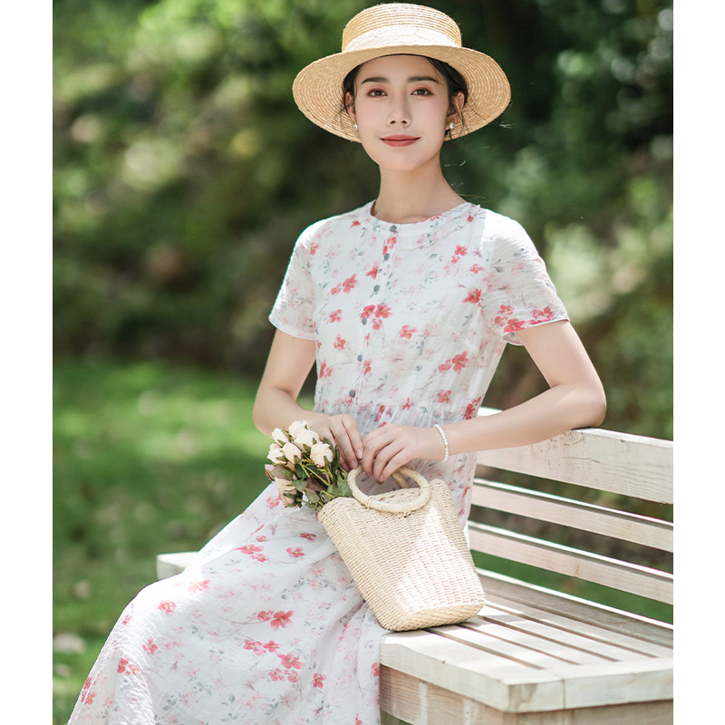 纻衣碎花短袖连衣裙女2025夏季新款修身显瘦减龄文艺气质中长裙子