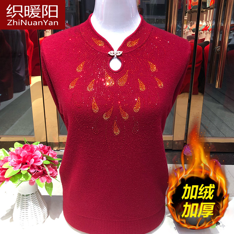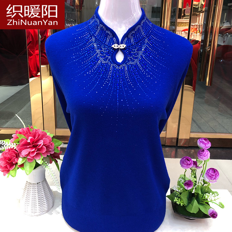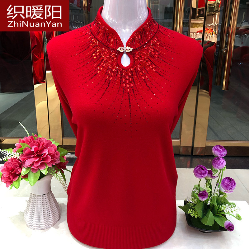 妈妈秋冬新款打底衫中老年洋气减龄毛衣女酒红色婆婆旗袍领羊毛衫
