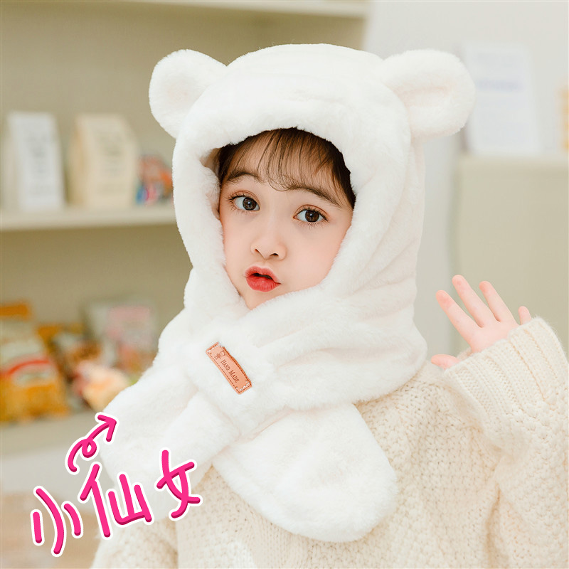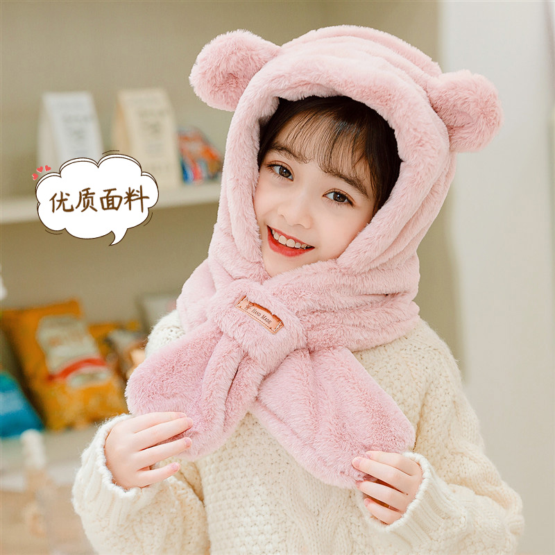 冬天儿童可爱小熊帽子围巾一体冬季新款男童女童宝宝加厚毛绒围脖