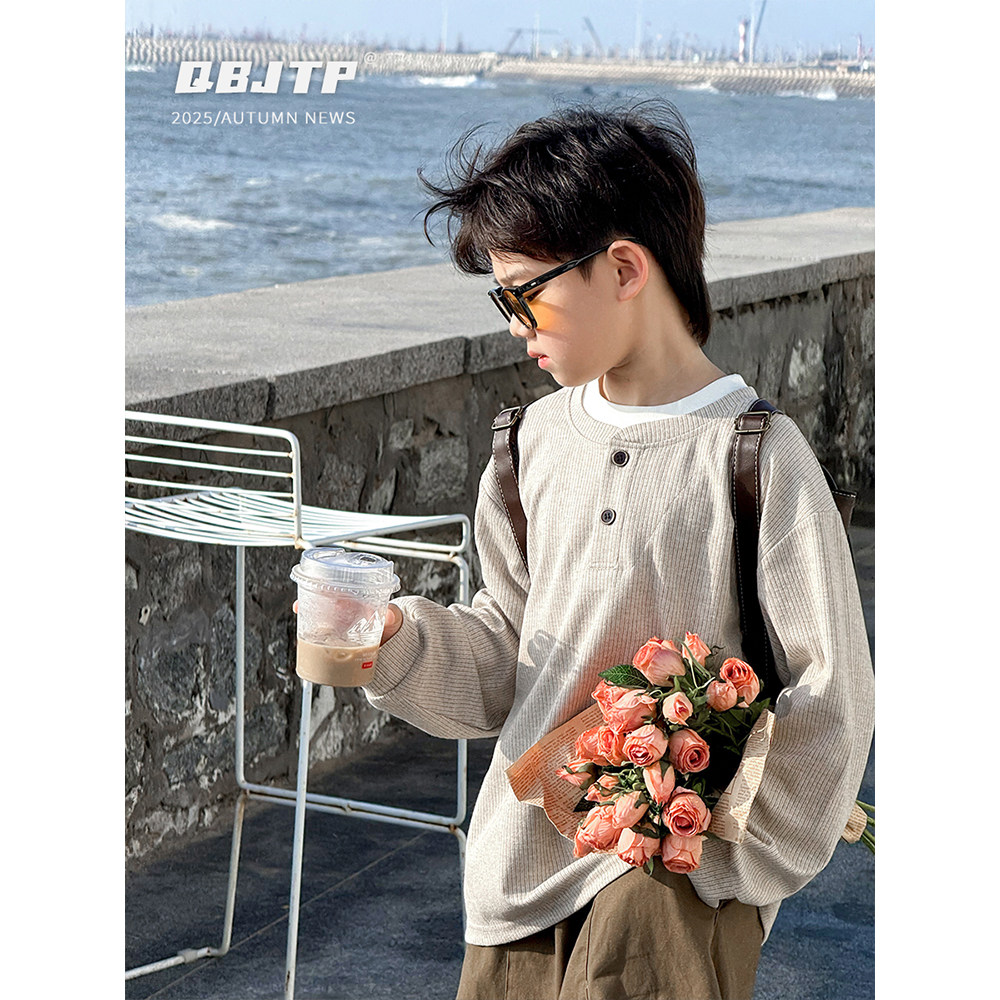 Q宝家童品8月新款 男童长袖T恤春秋儿童日系假两件中大童卫衣上衣