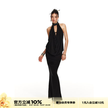 【刘恋同款】后背十字架挂脖荡领修身上衣性感辣妹褶皱波浪鱼尾裙