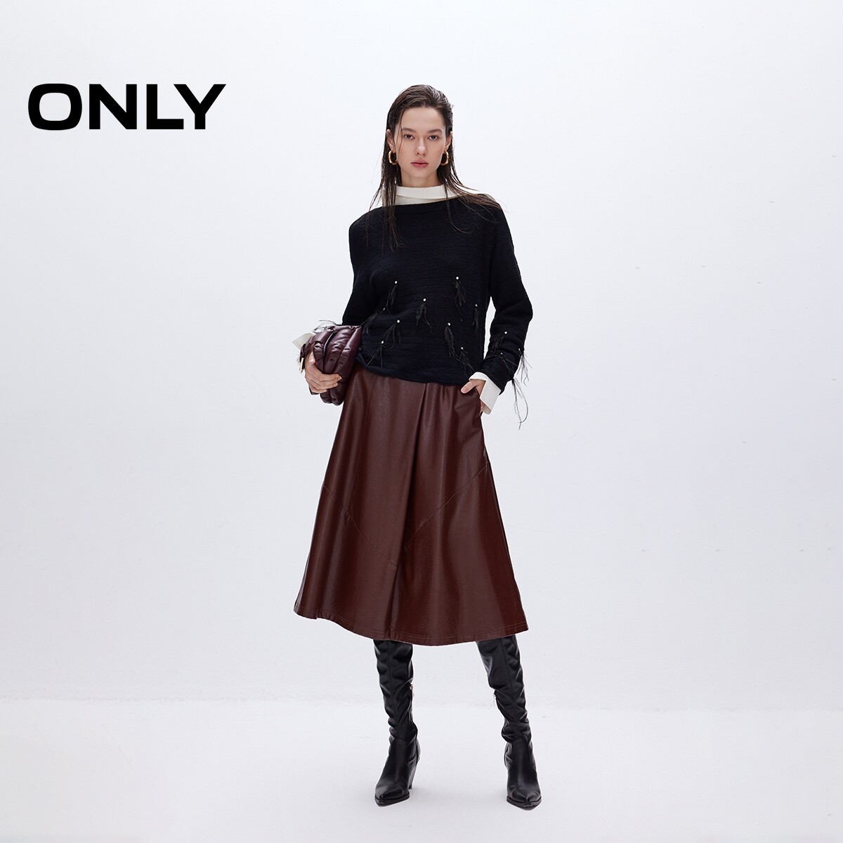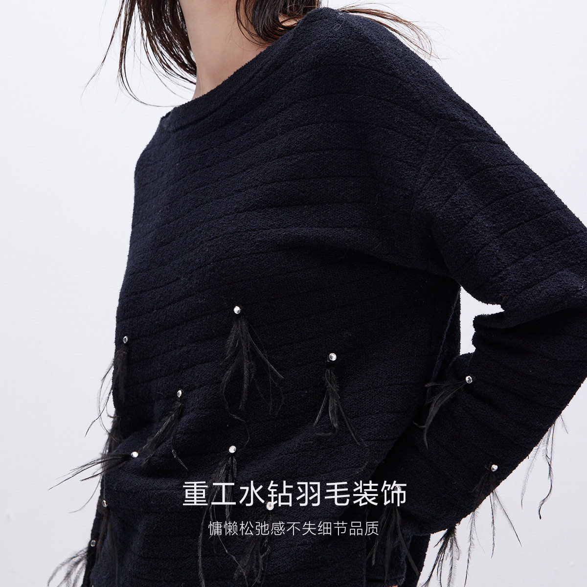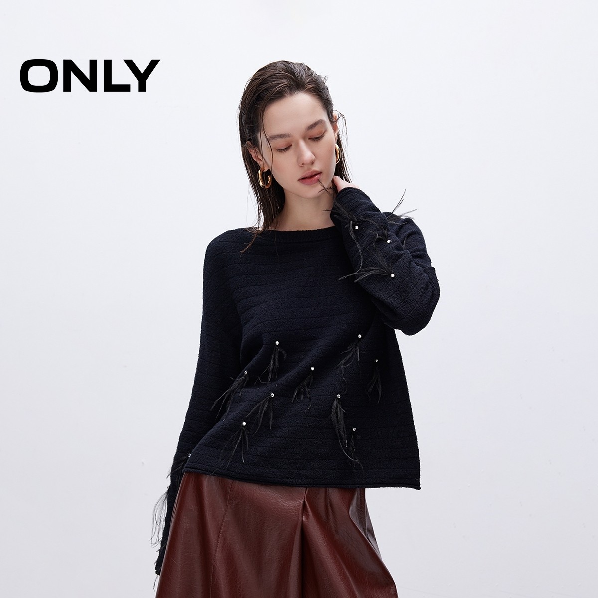 ONLY2025秋季新款羽毛水钻饰黑色慵懒烫钻设计感宽松毛衣针织衫女