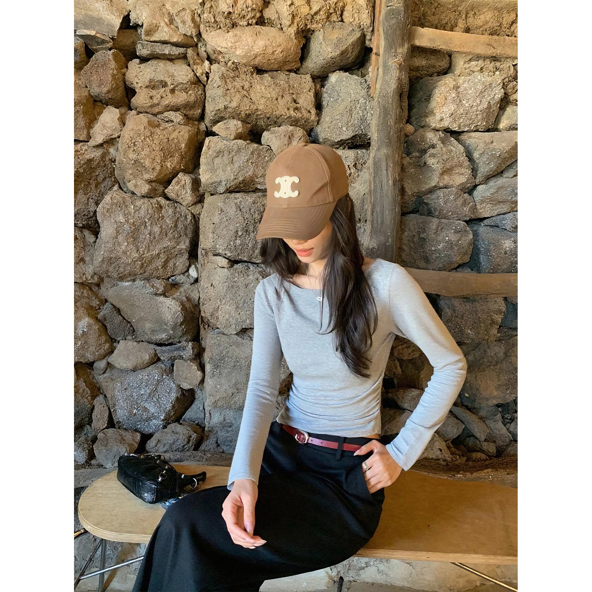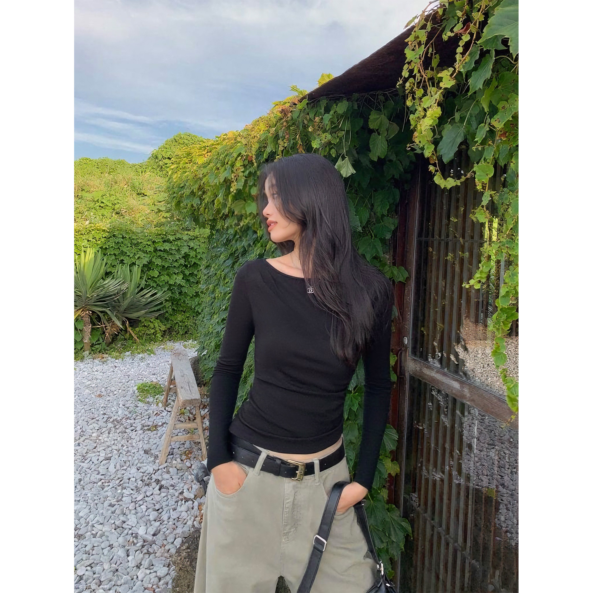 pusumede 纸片人tee 船领中袖/长袖T恤女褶皱修身五分袖针织上衣