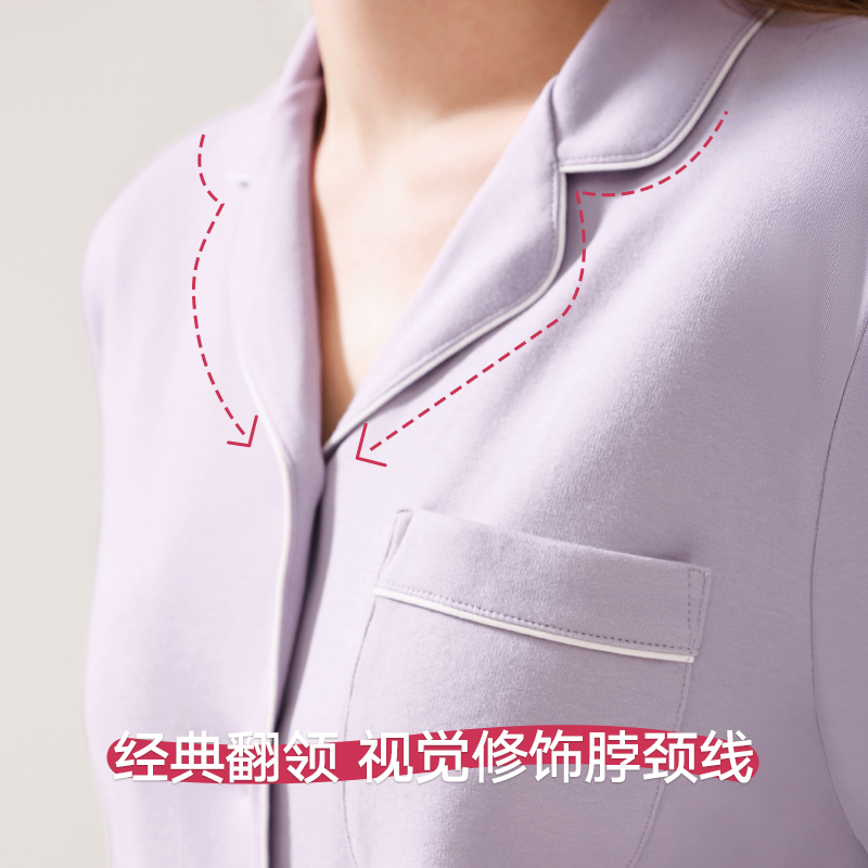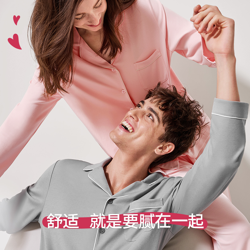曼妮芬情侣翻领睡衣女士空调房家居服男舒适睡裤套装长袖起居服合