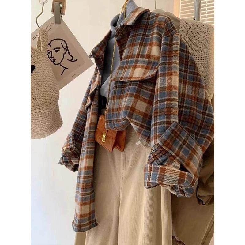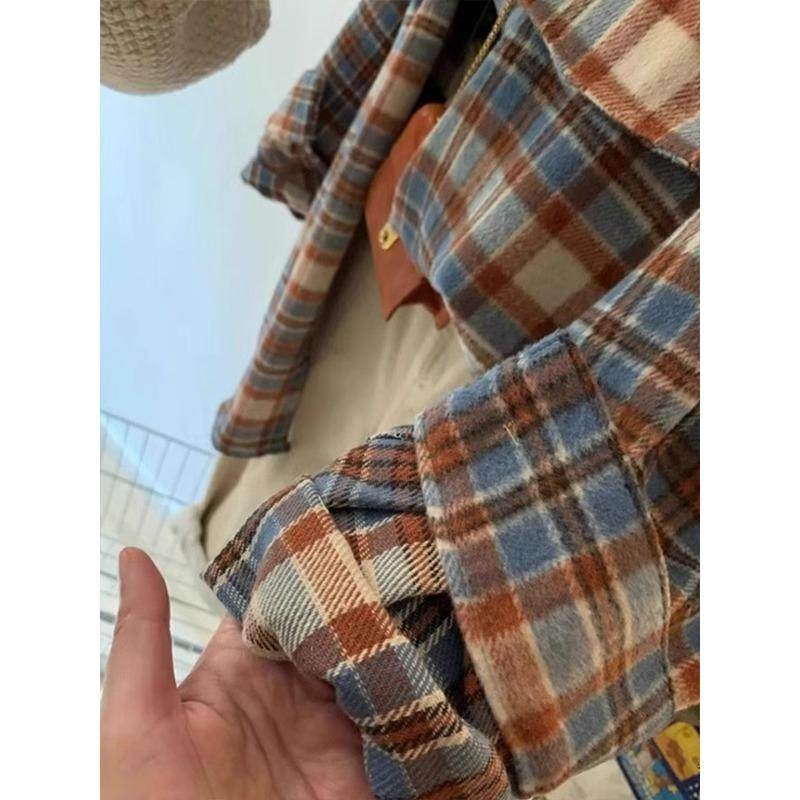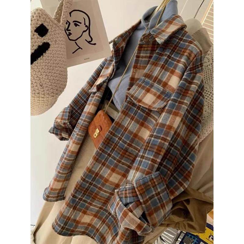 拉夏贝尔慵懒风磨毛格子衬衫女秋冬2025新款宽松显瘦长袖外套上衣