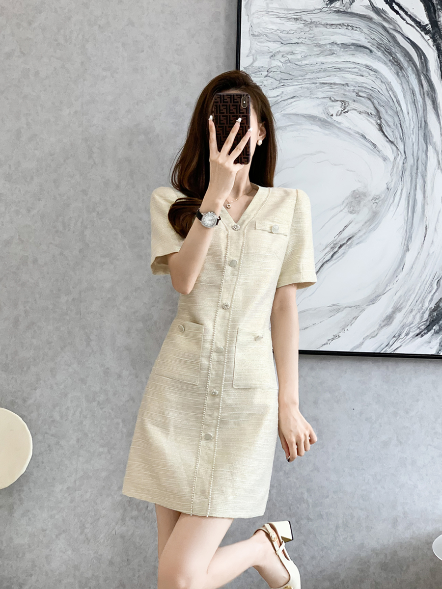 高级感夏日小香面料V领法式别致连衣裙夏季女泡泡袖洋气轻奢A字裙