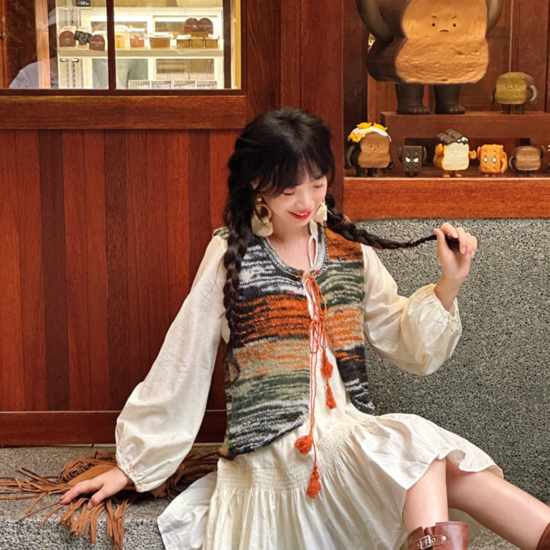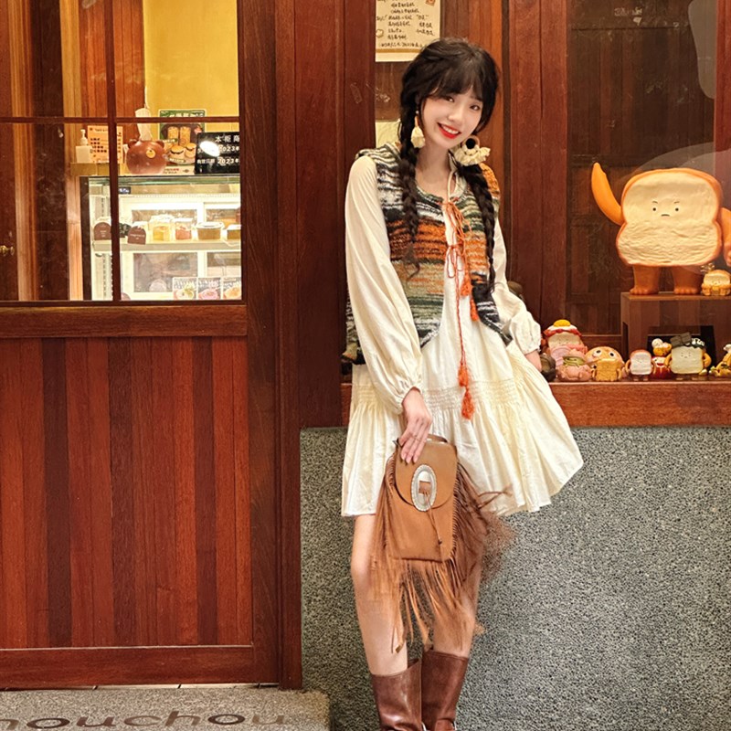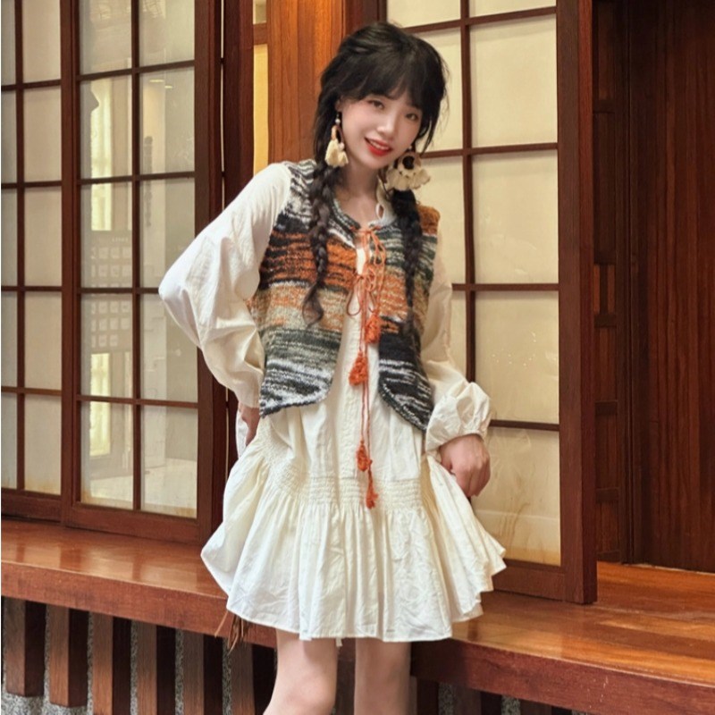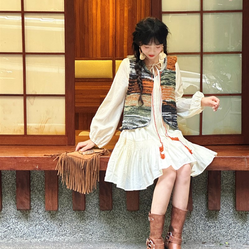 速发旅游穿搭复古民族风渐变条纹叠穿背心马甲短款宽松长袖连衣裙