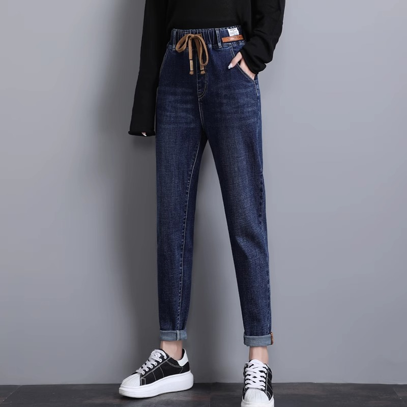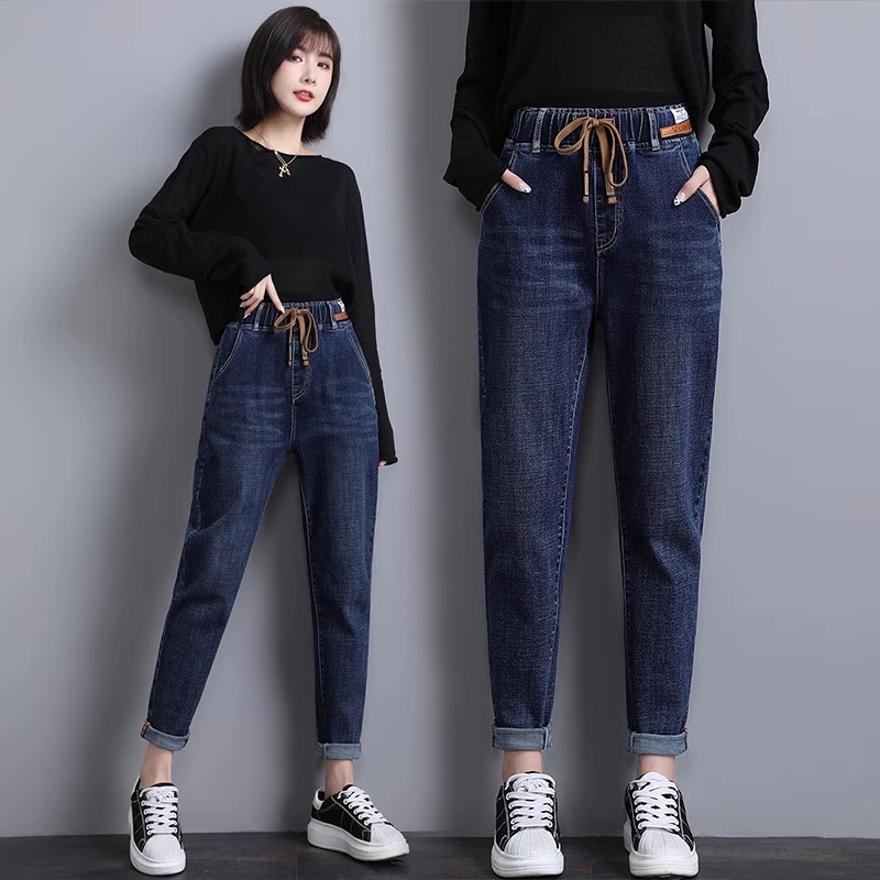 大码宽松牛仔裤女弹力松紧腰胖MM裤子胯宽大腿粗200斤长裤哈伦裤