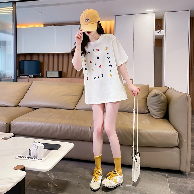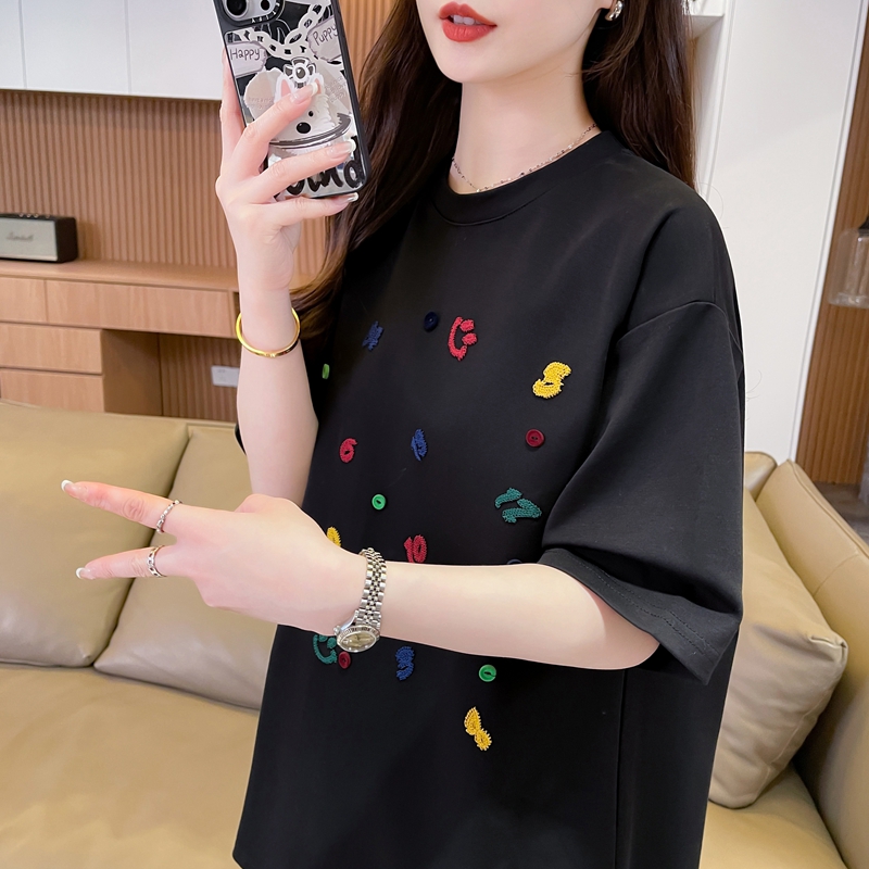 独特纯棉中长款字母刺绣短袖T恤女时尚个性百搭休闲洋气宽松上衣