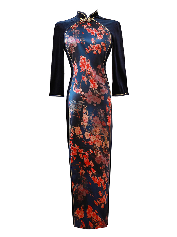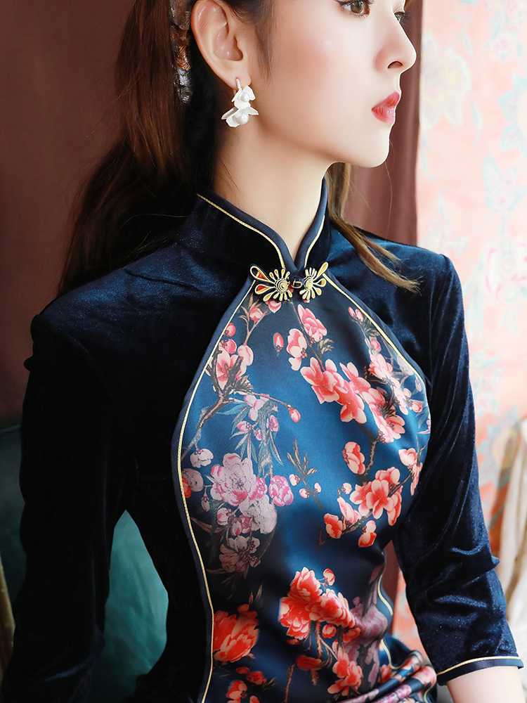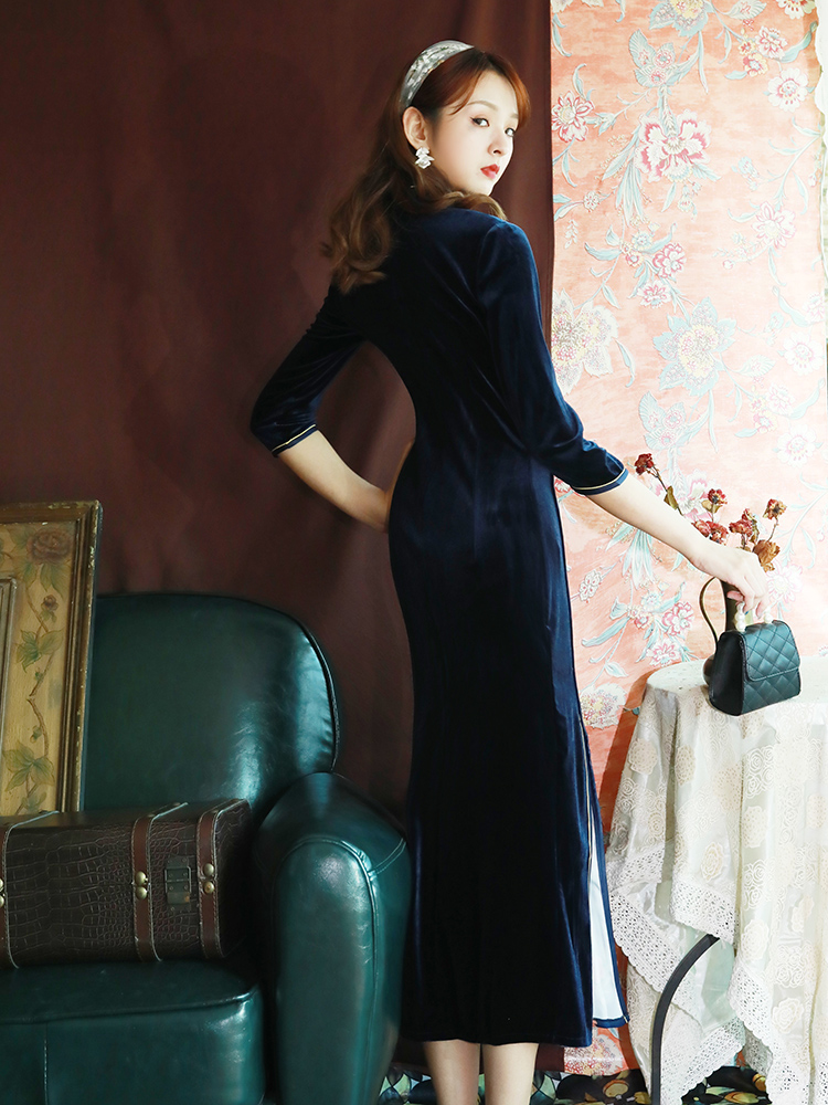 藏蓝色丝绒旗袍年轻款气质修身秋