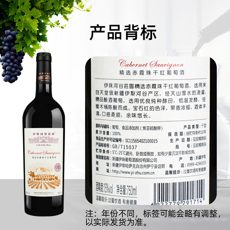 伊珠庄园精选赤霞珠干红葡萄酒13度750ml橡木陈酿新疆伊犁红酒
