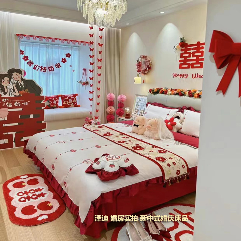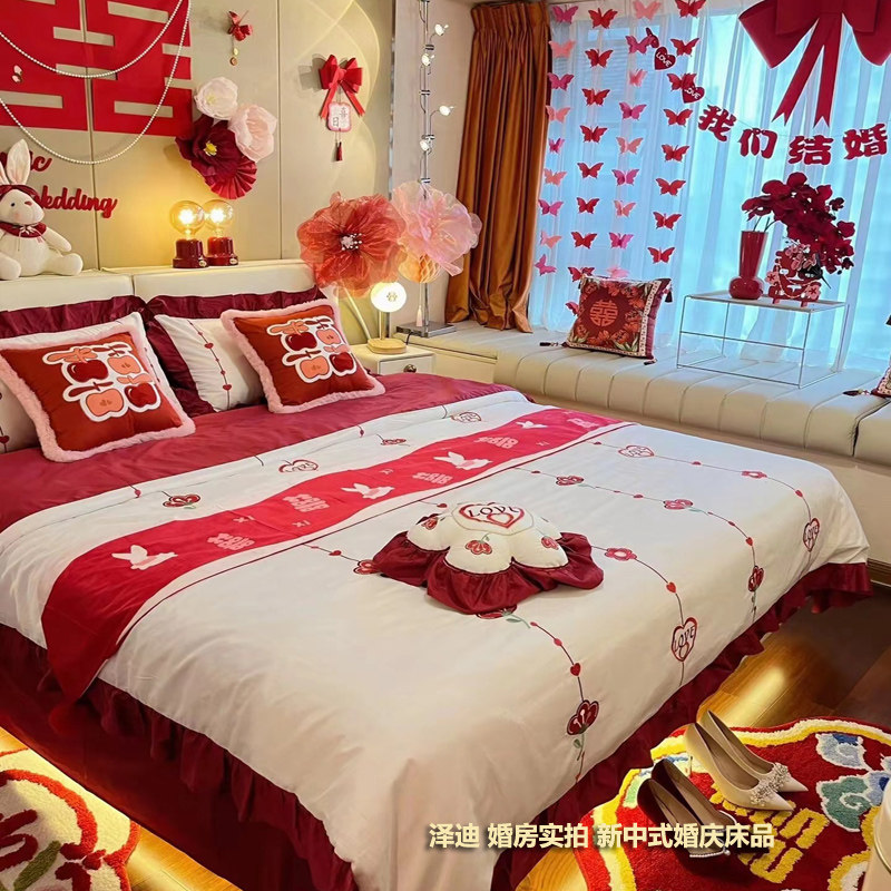 新中式婚房实拍纯棉婚庆四件套