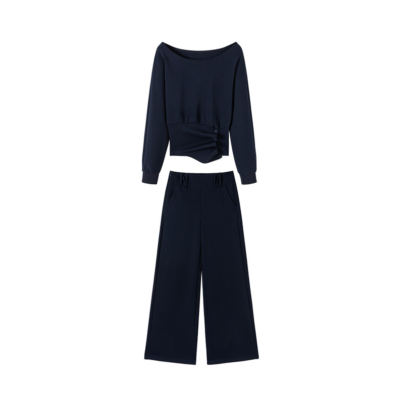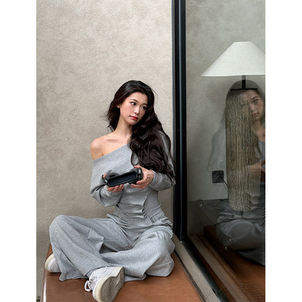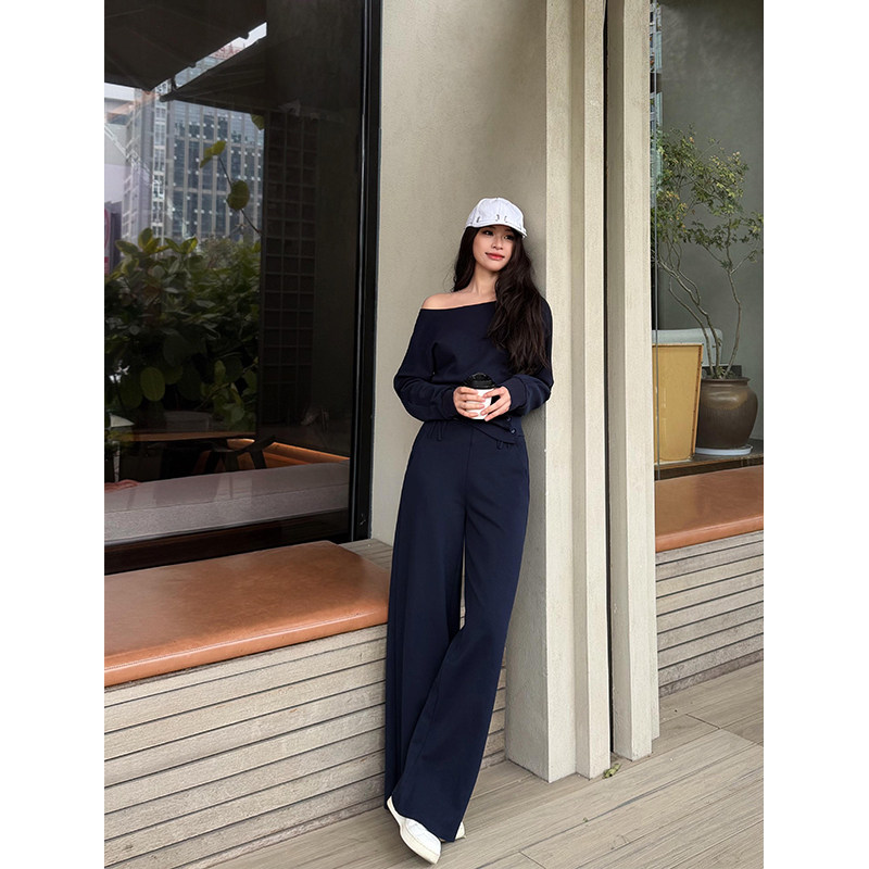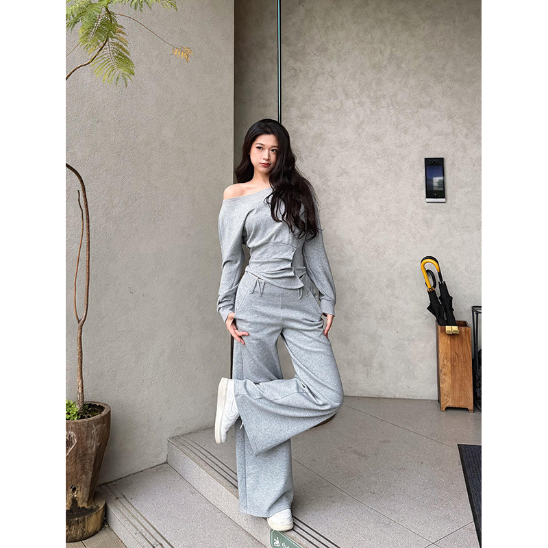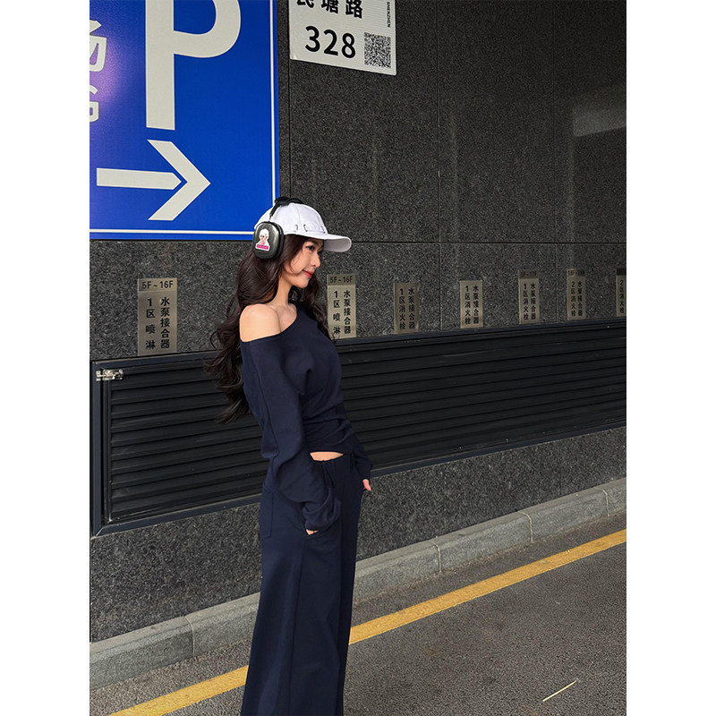 六指导 弗里假日 韩系休闲斜肩卫衣女设计感显瘦通勤直筒裤套装春