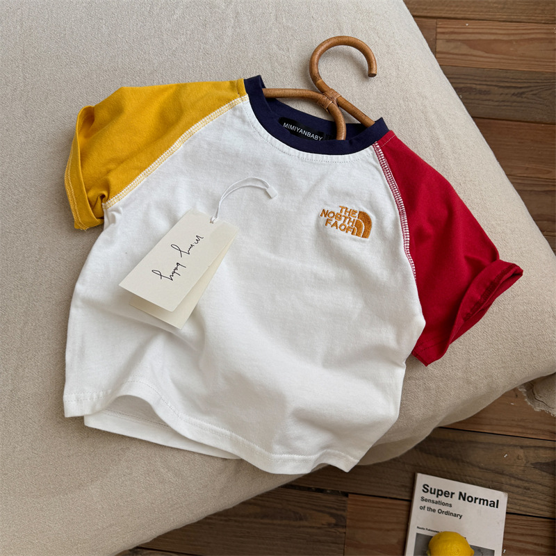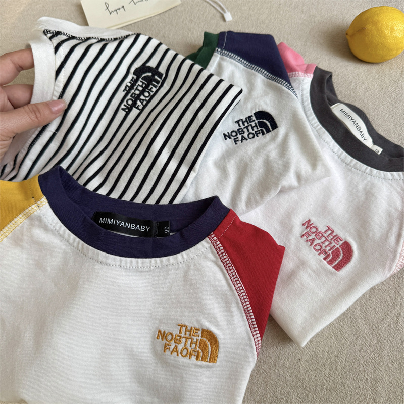 2025夏季新款童装幼儿短袖T恤拼色纯棉男女童半袖落肩款字母刺绣T