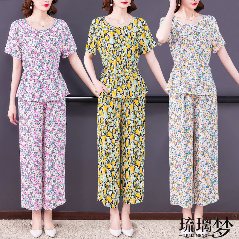 中老年棉绸套装女夏装妈妈时尚外穿洋气短袖阔腿裤休闲两件套大码