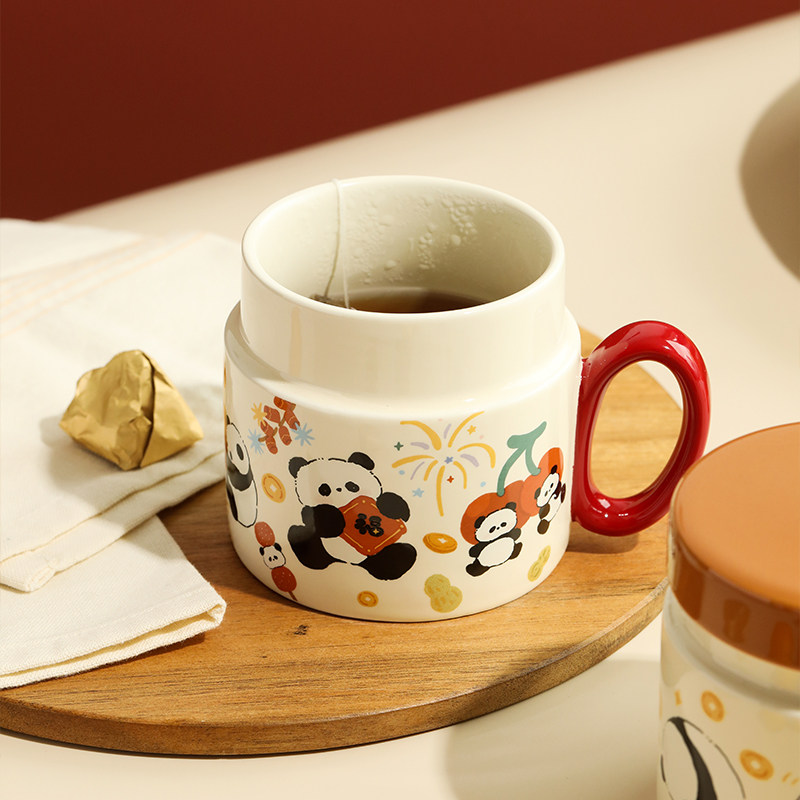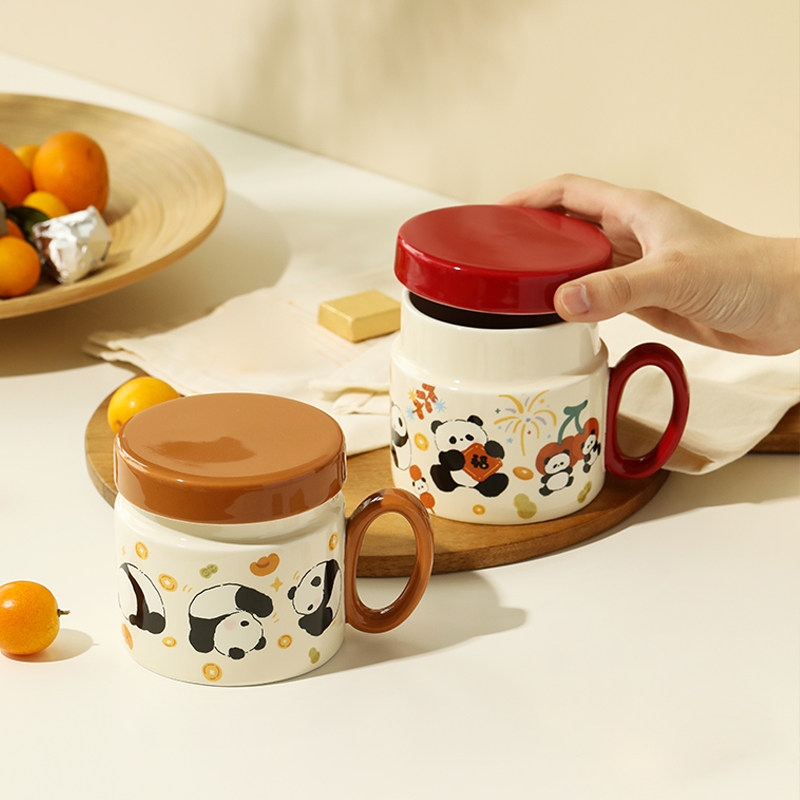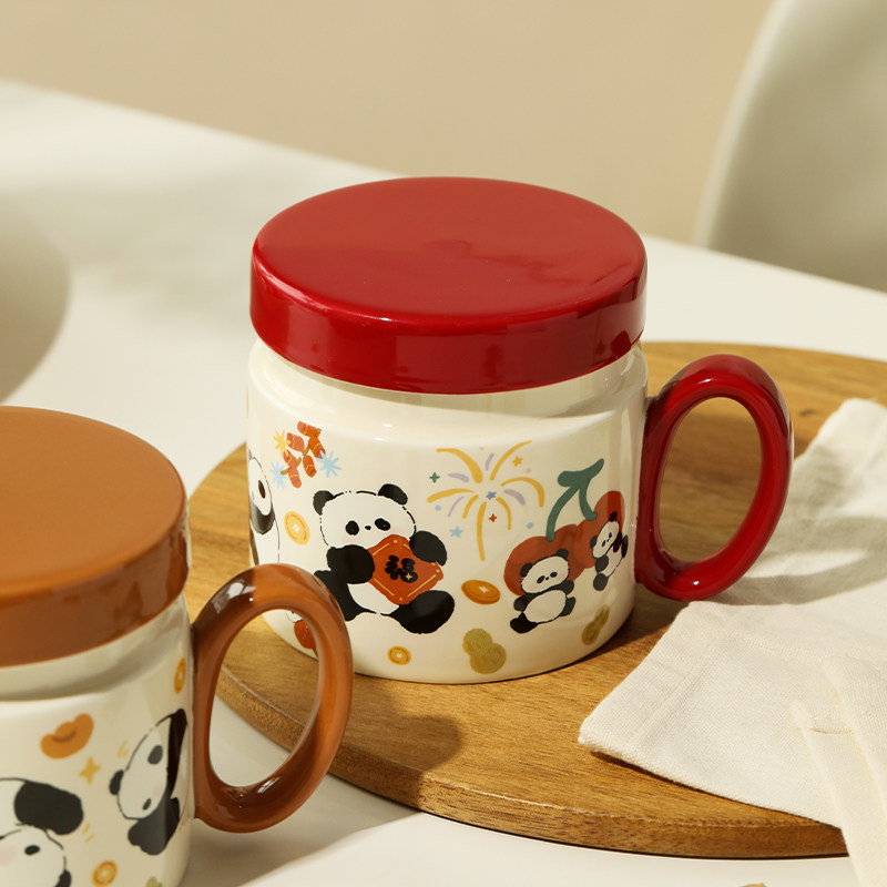 蓝莲花熊猫2025新款杯子马克杯陶瓷带盖水杯家用办公室小众设计感