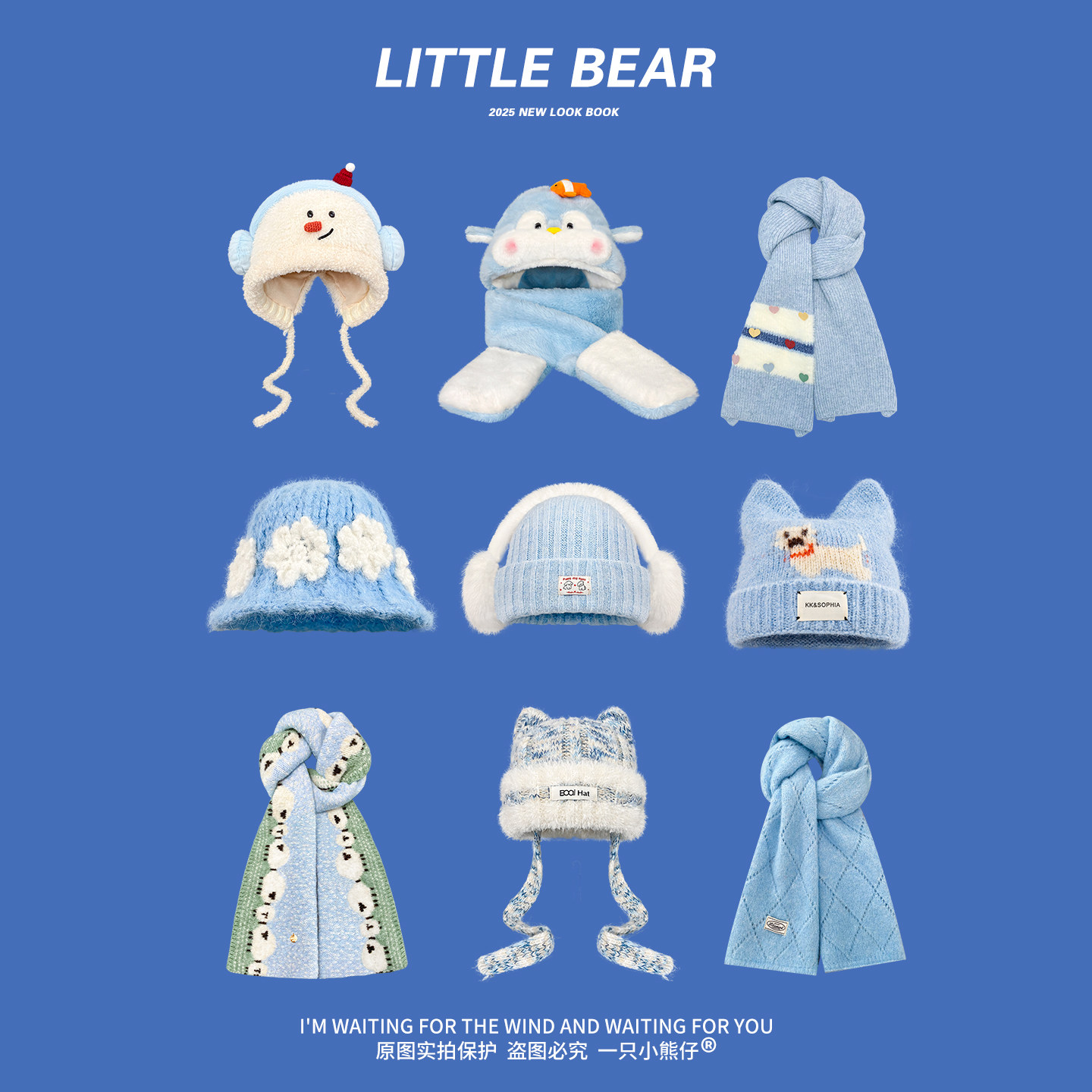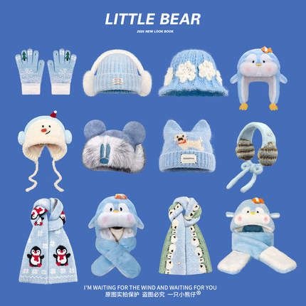 小清新蓝色系列针织毛线帽女冬季毛绒帽子围巾一体保暖围脖雷锋帽