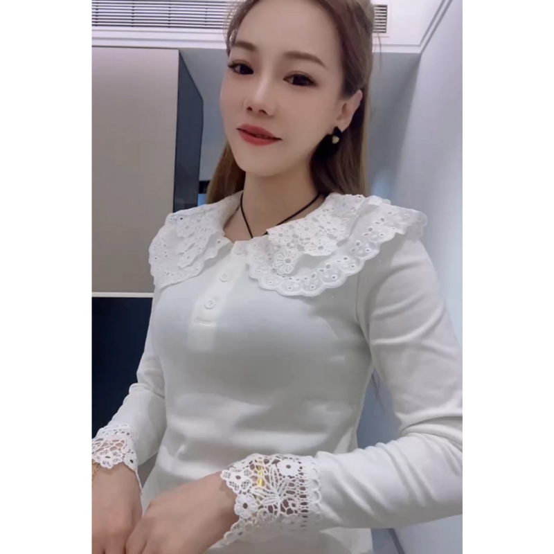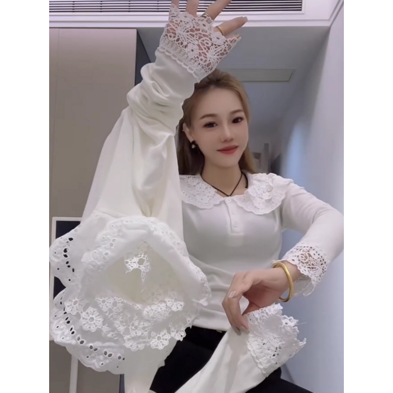 白色甜美风双层蕾丝娃娃领长袖T恤女2025新款洋气减龄修身打底衫