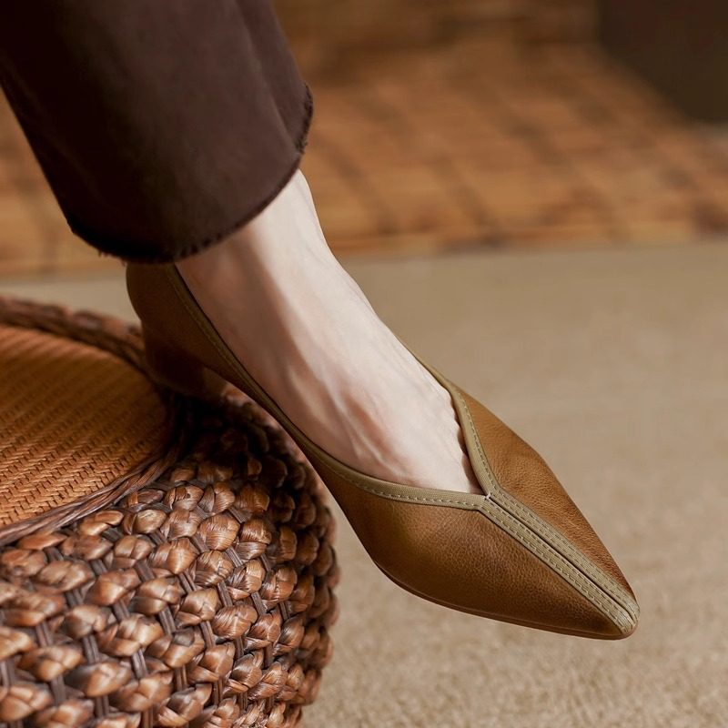 复古简约通勤单鞋浅口V口尖头