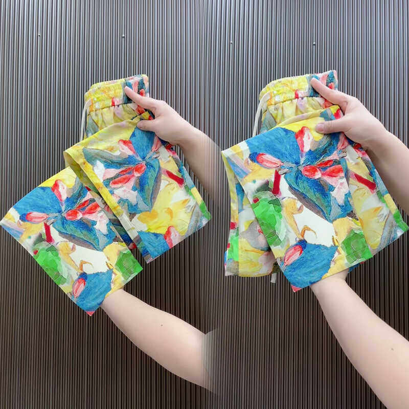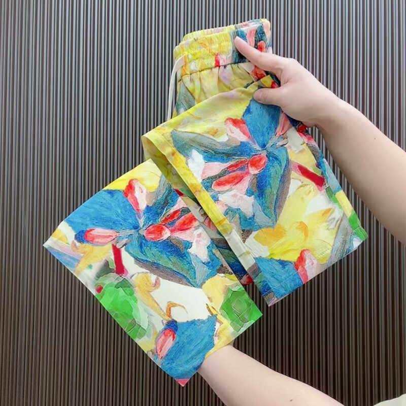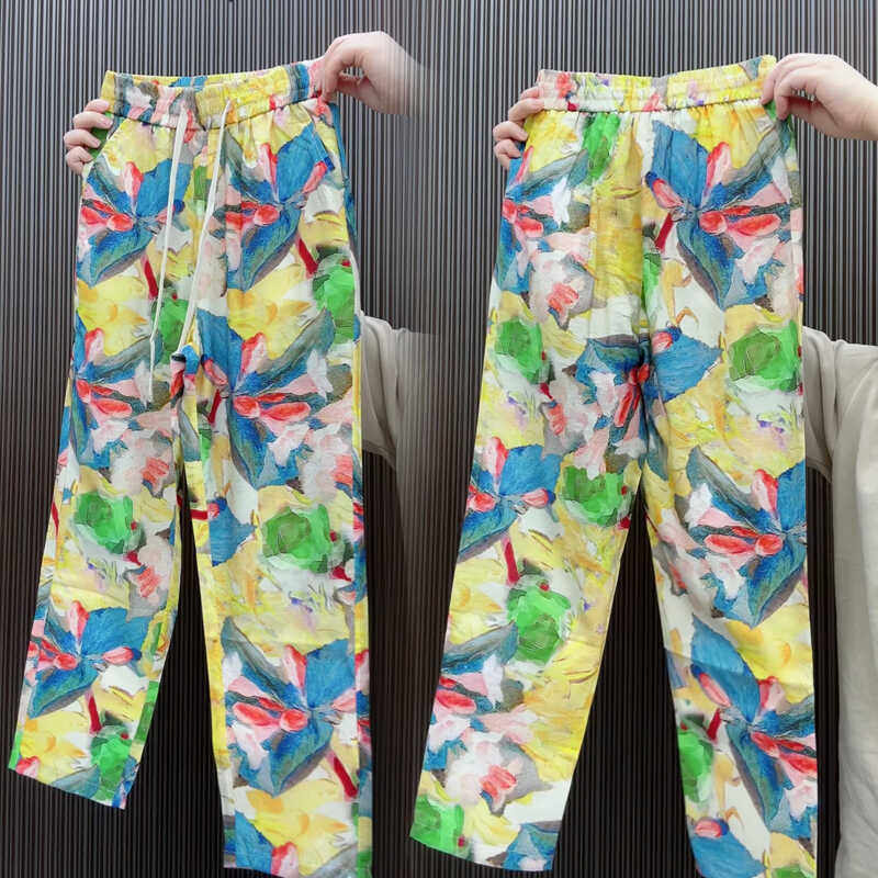 夏季新款花色直筒裤薄款冰丝裤时尚女裤松紧腰休闲裤九分裤提花裤