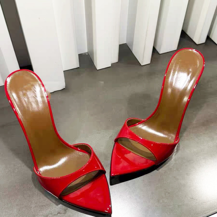 2025新款露趾尖头漆皮细跟一字拖女夏性感黑色外穿凉拖鞋高跟鞋女